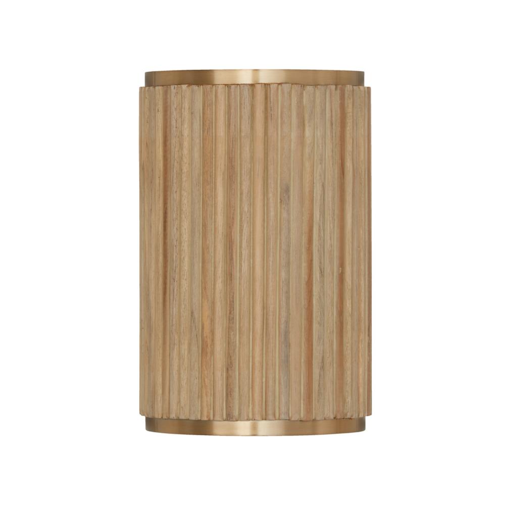 The Donovan Sconce pairs artisan texture with mid-century modern style. Formed into a semi-cylinder, the White Wash fluted mango wood shade evokes a natural elegance, while the Matte Brass details add a warm glow.