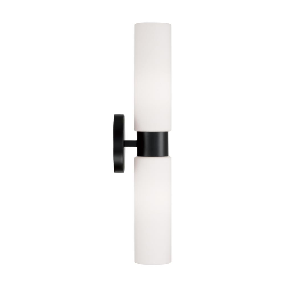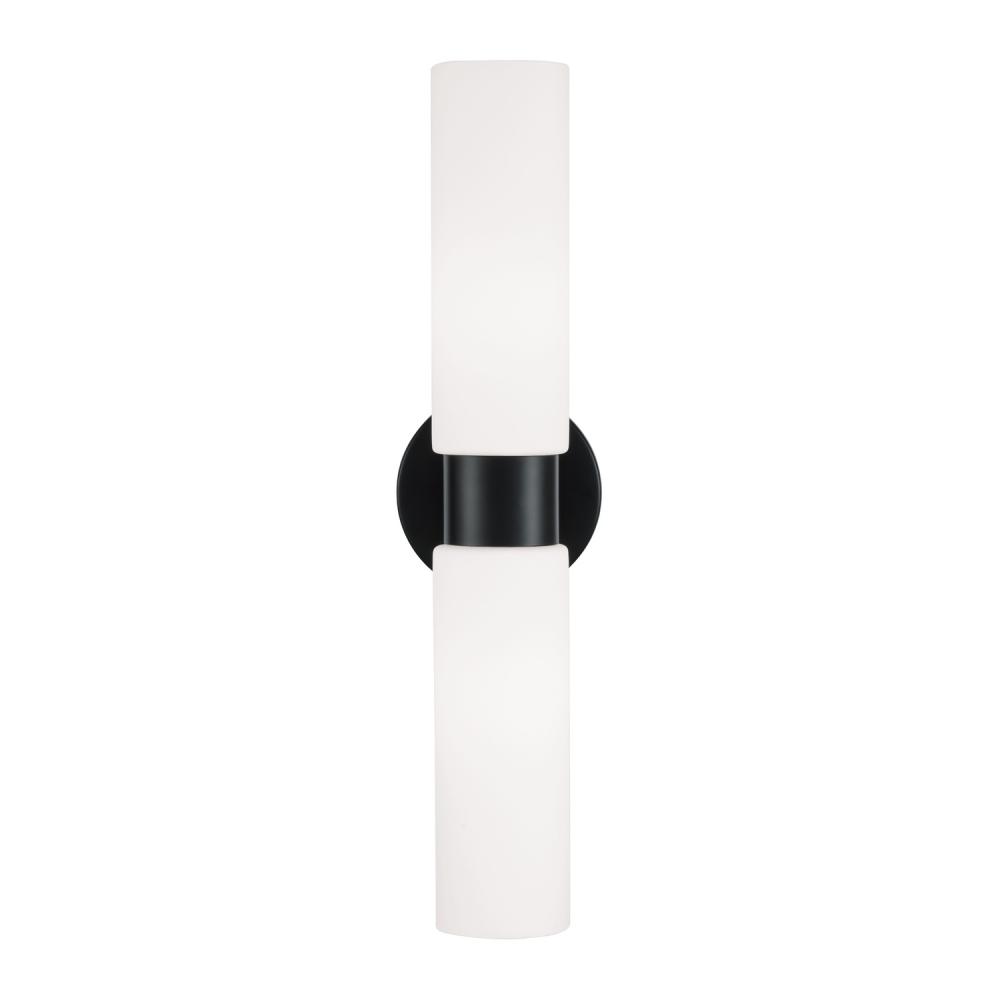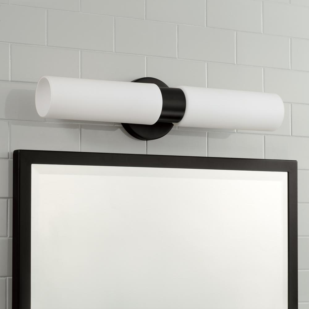 Sleek and classic, the Theo Dual Sconce for HomePlace punctuates any powder room. The Matte Black finish adds a modern contrast, while the elongated Soft White glass shades create a sophisticated glow.