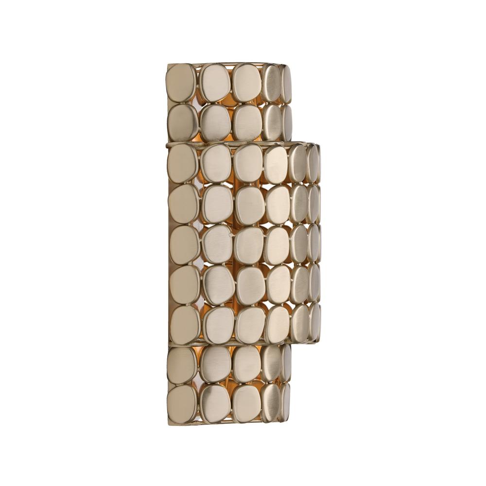 Invite captivating shimmer to any space with the Eliana Sconce. Crafted in a tiered cylindrical silhouette, the unique medallions alternate catching the light while teasing glimpses of illumination from within. The refined Champagne Brass finish creates elegant, dimensional shine from every angle.