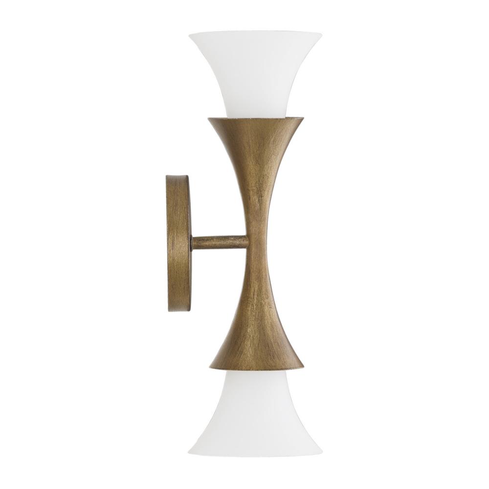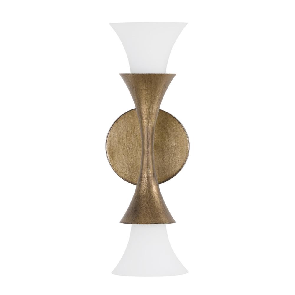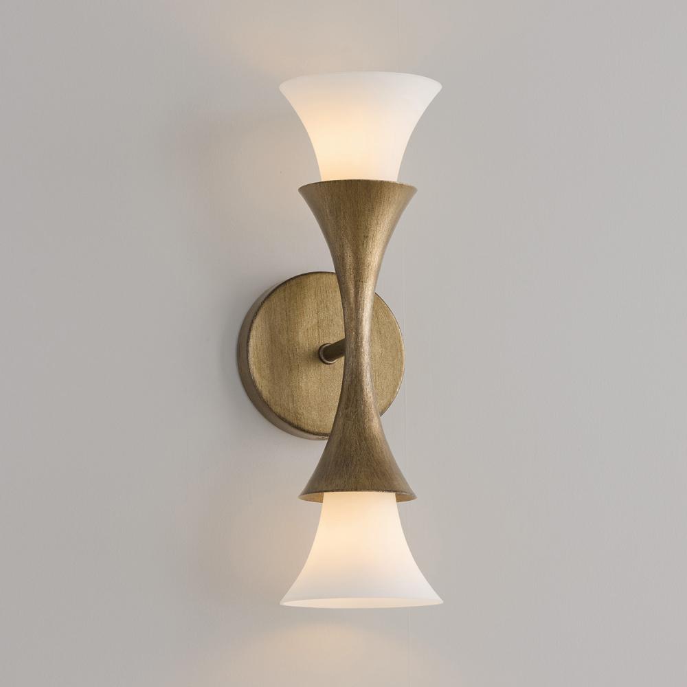 The Nola Dual Sconce is a uniquely stunning luminaire in a classic candlesleeve design with a modern twist. Nestled into flared silhouettes, the Soft White glass details cast a warm ambient glow against the rich, amber shimmer of the Mystic Luster finish.