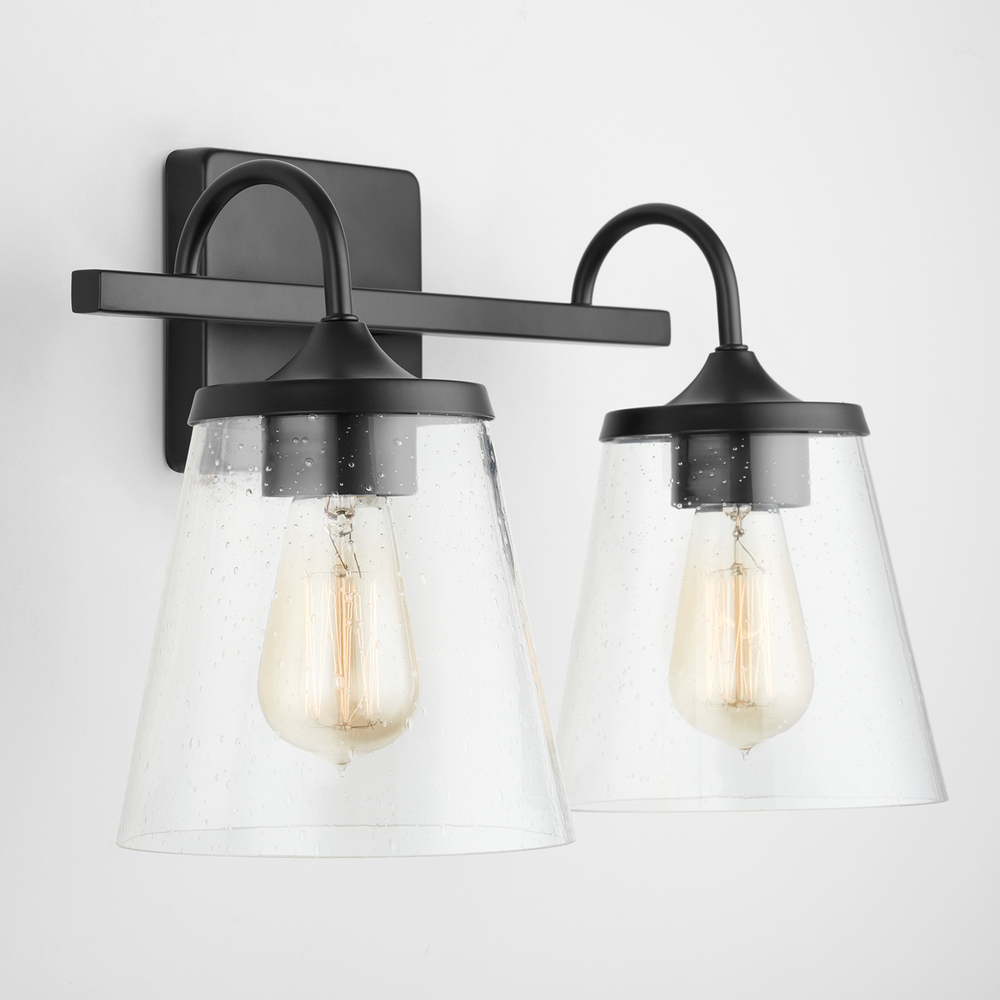 The wide cone seeded glass on this 2-Light Vanity is suspended by a simple arched arm and tapered metal cap makes it a timeless shape for any bathroom vanity.