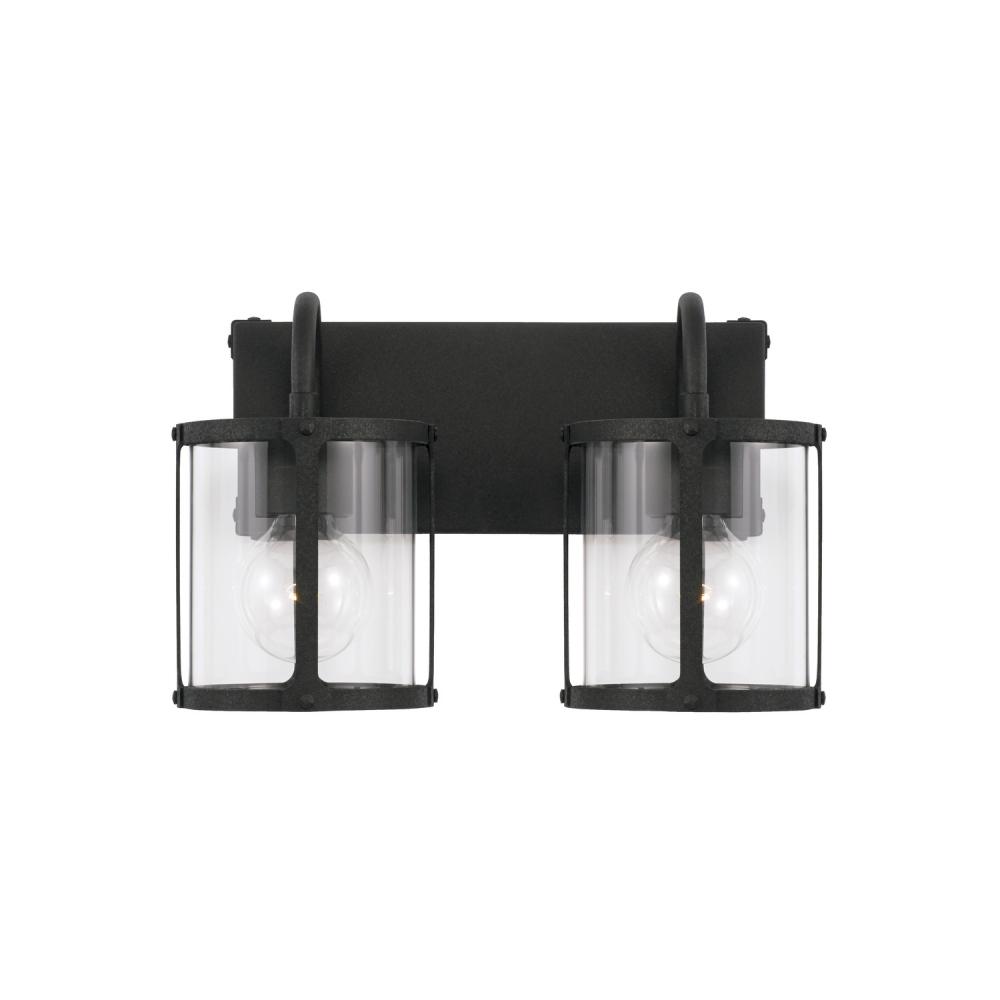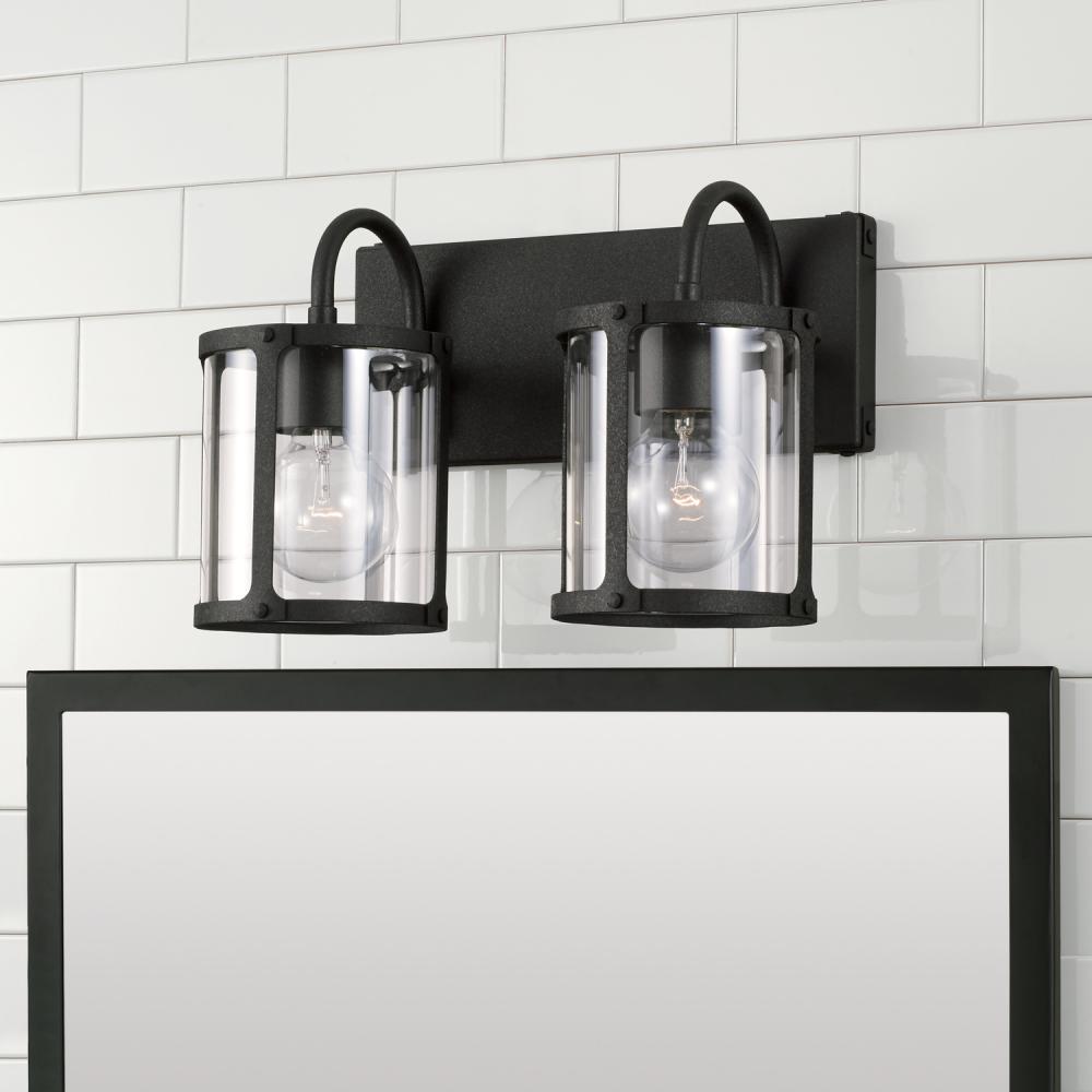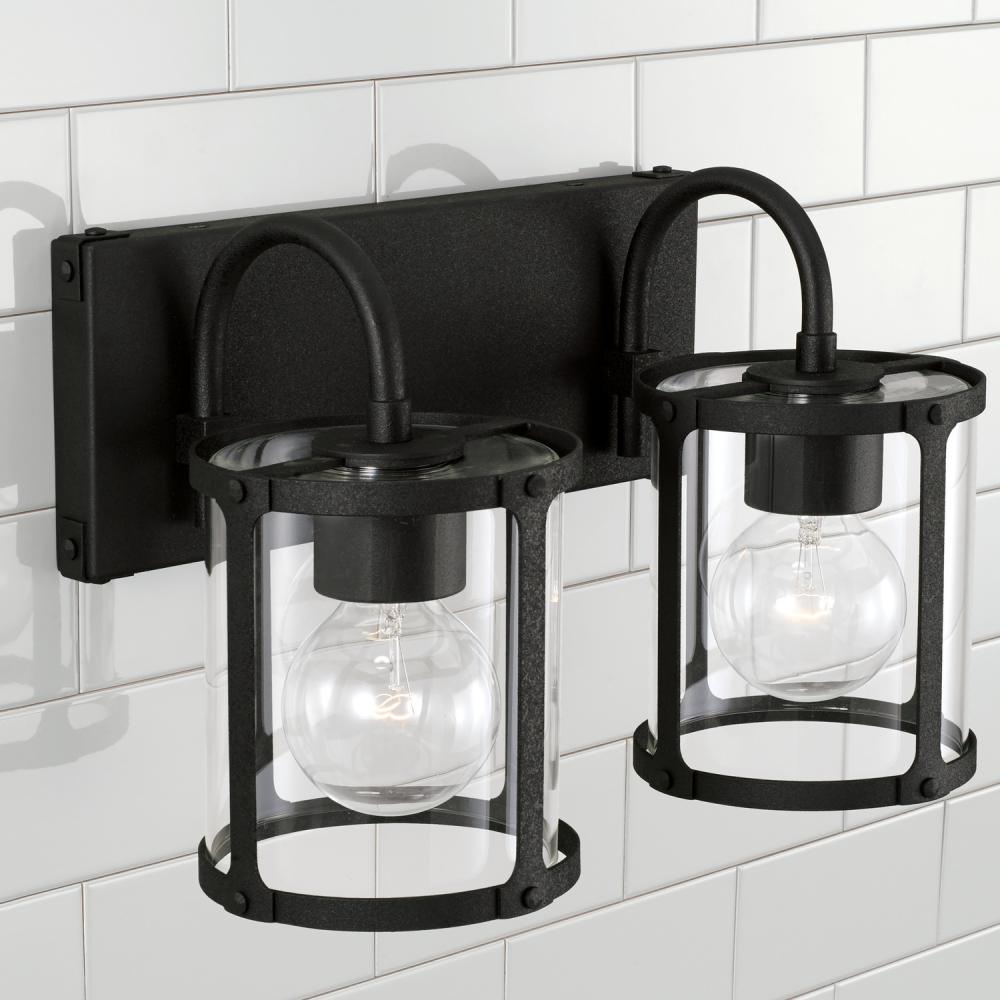 Bold lines and punctuated details create the Brennen 2-Light Vanity. The Black Iron finish and rivet head accents provide a rugged, visual texture for industrial appeal and the clear glass panels soften the illumination. Also available in 3-Light or 4-Light.