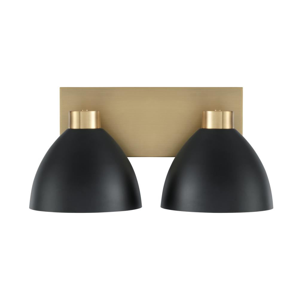 Invite charming style to any powder room with the Ross 2-Light Vanity. The curved Black metal shades with White interior create a retro aesthetic, while the Aged Brass details give a nod to mid-century style.