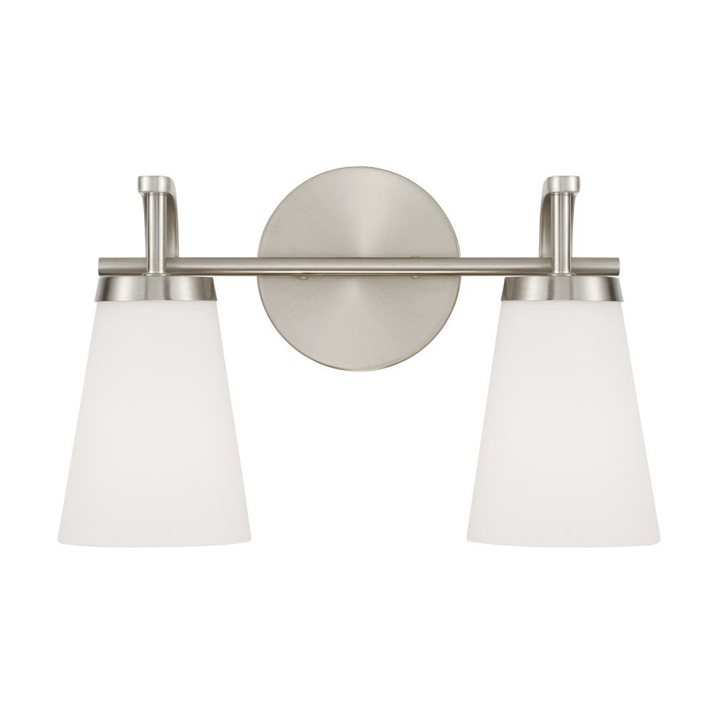 The Drake 2-Light Vanity for HomePlace brings clean and classic style to any space. Paired with sleek, intersecting arms, the tapered Soft White glass shades create an ambient glow, finished in Brushed Nickel for versatile style.