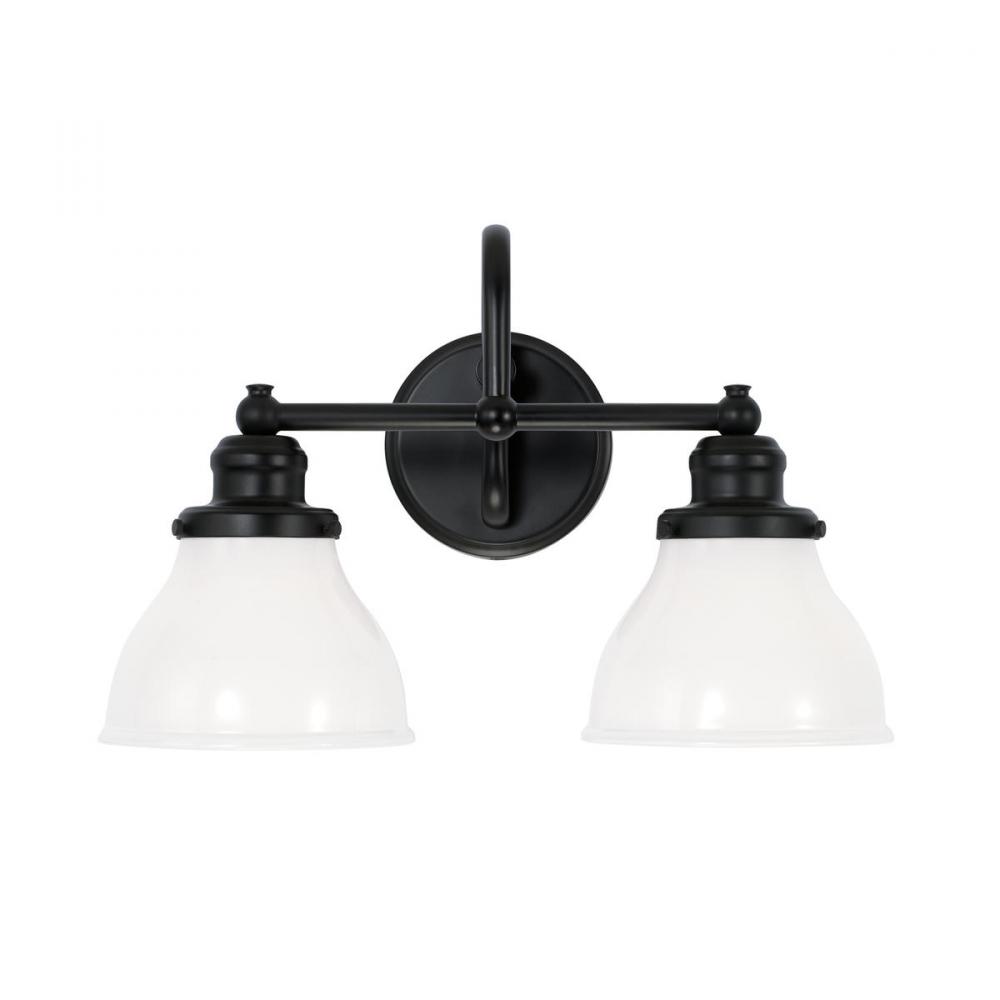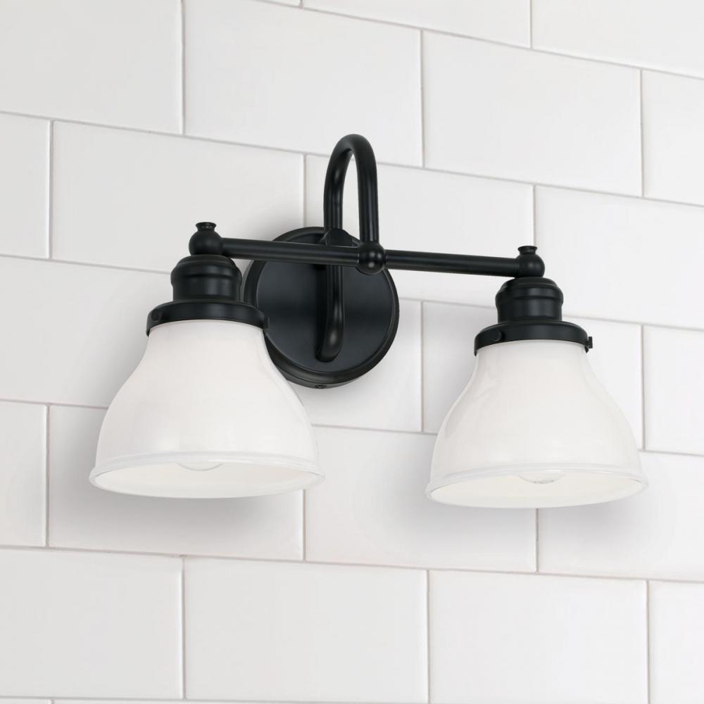 Featuring a Matte Black finish and cloche-style Milk Glass shades, the Baxter 2-light vanity brings tasteful illumination to your space. A clean profile with u-shaped arm and straight rod speak to industrial inspiration.