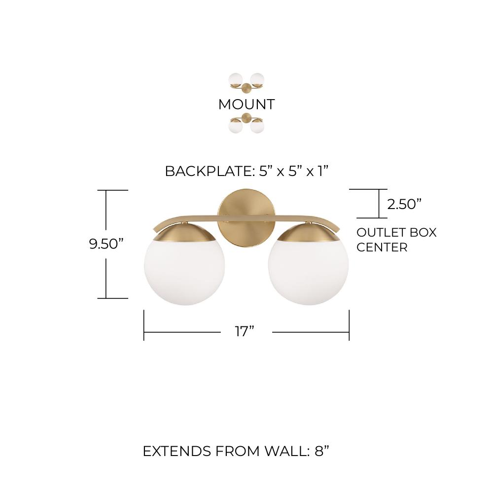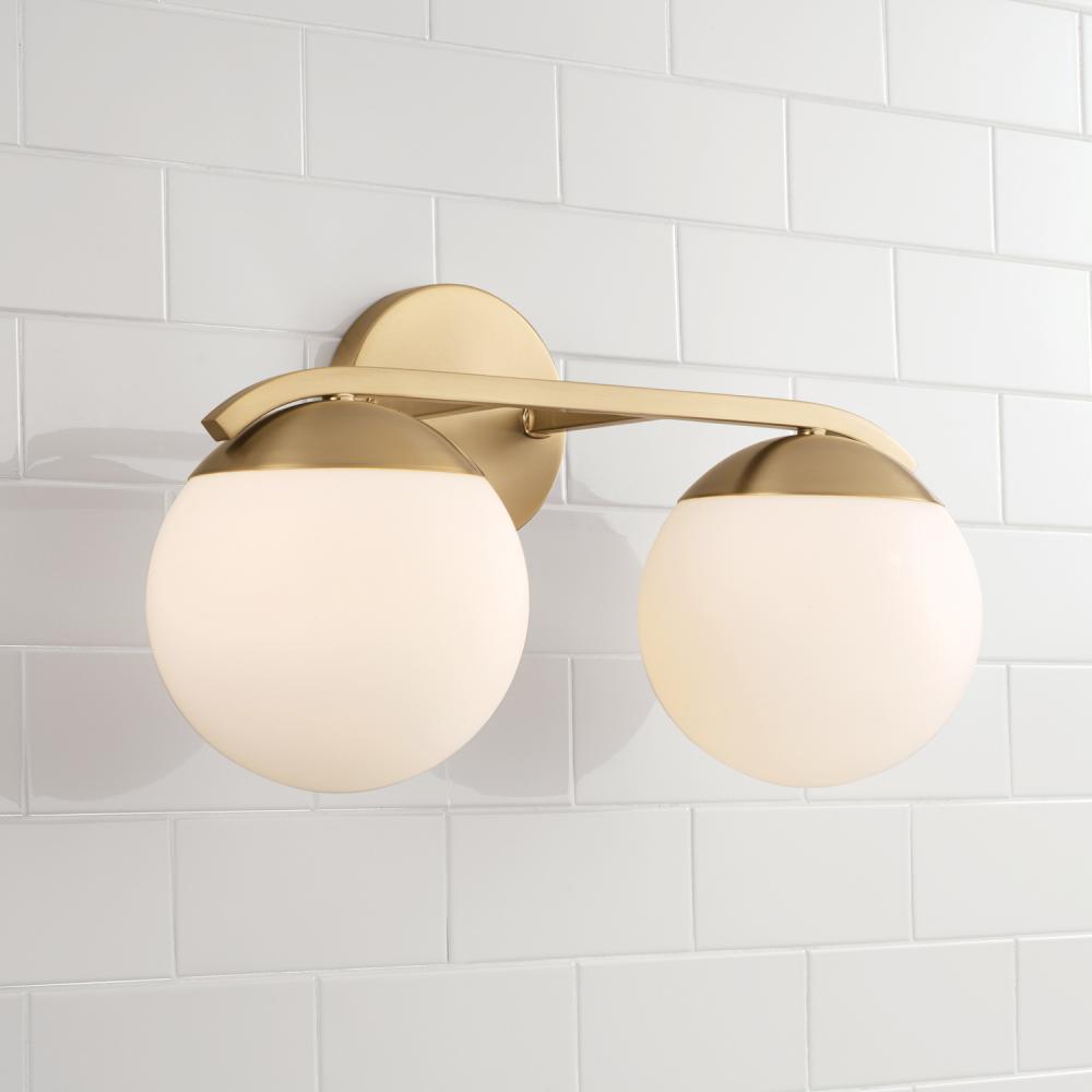 Crafted with circular forms and soft white glass, the Oliver 2-Light Vanity brings effortless glamour to any powder room. The curved arms and accents evoke elegant style, while the Matte Brass finish creates a sophisticated shimmer.