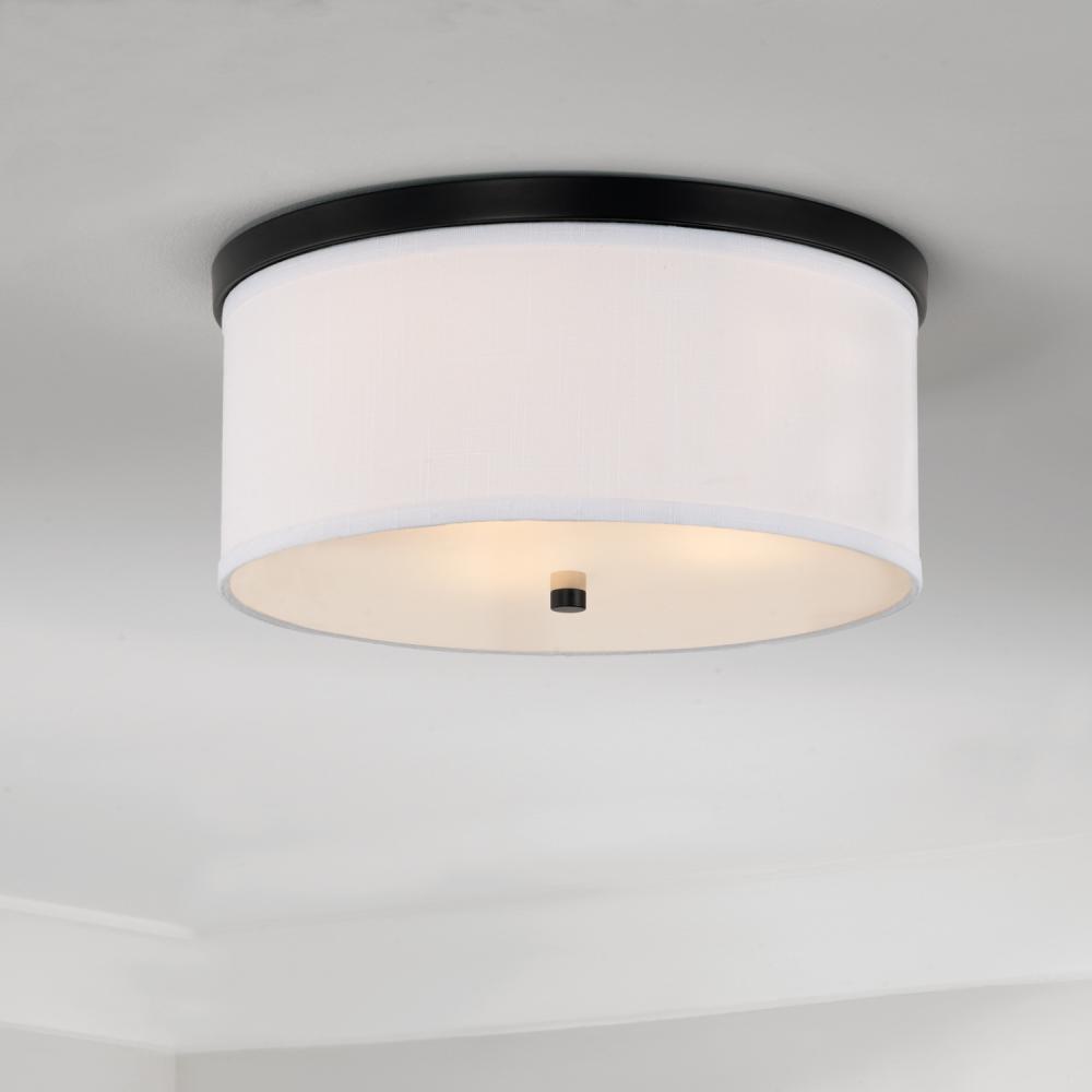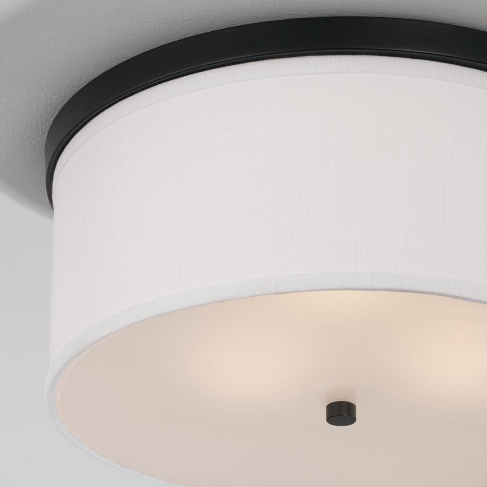 DETAILS: Matte Black accents support a simple fabric shade and soft white diffuser.