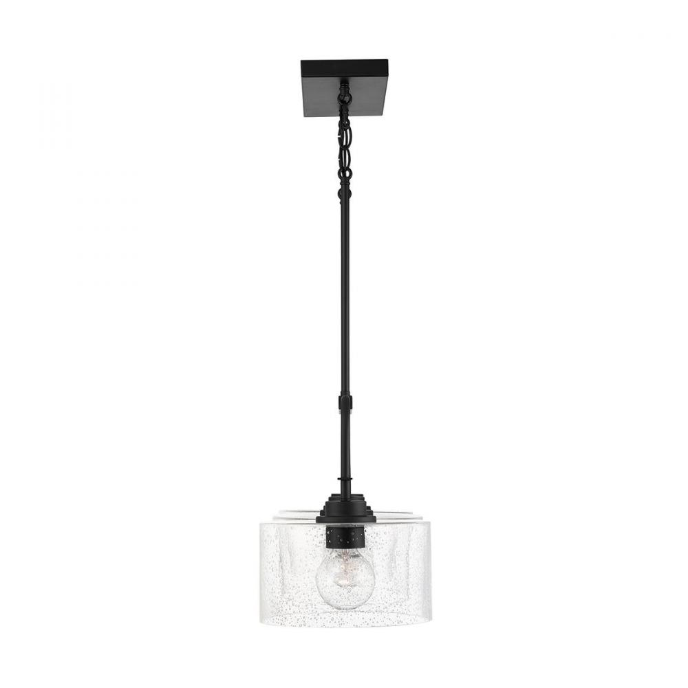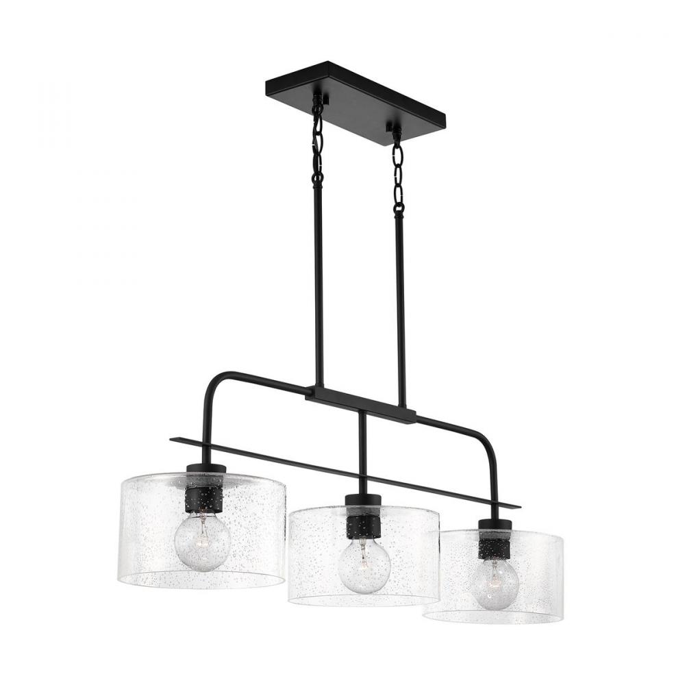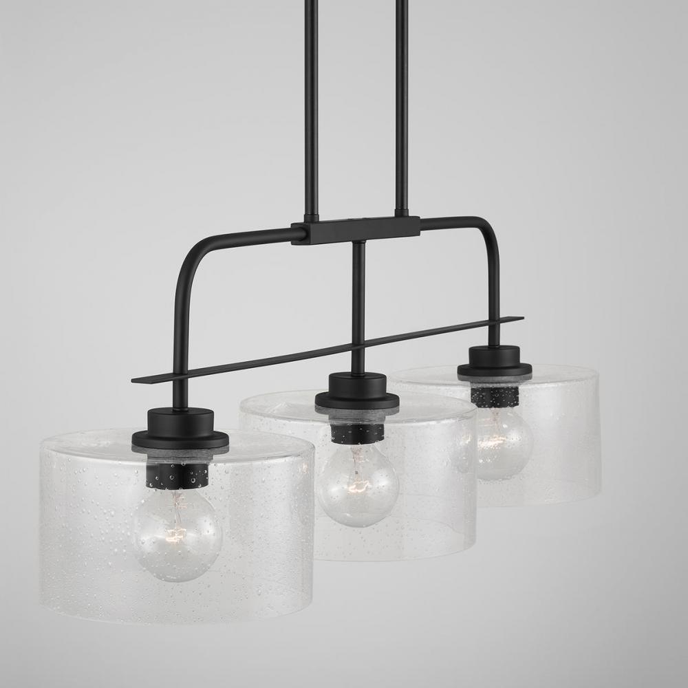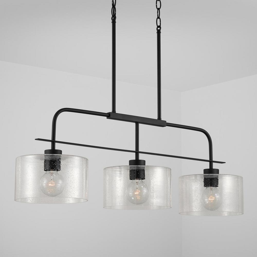 The unique metal frame suspending wide conical seeded glass makes this linear fixture versatile in both style and size. The island measures 36 wide and is available in Brushed Nickel, Matte Black and Bronze.