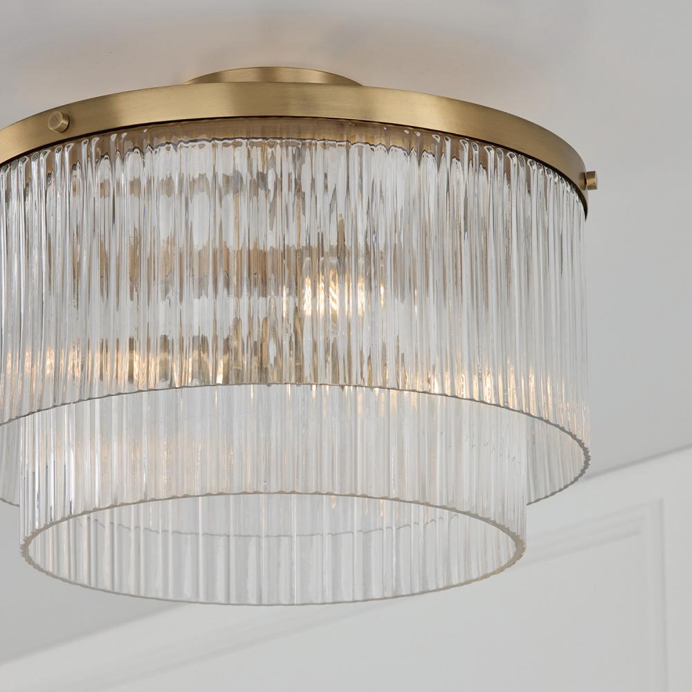DETAILS: Unique Beveled Fluted glass illuminates stunning texture while the Aged Brass finish creates a classic aesthetic. Can be hung as a pendant or semi-flush.