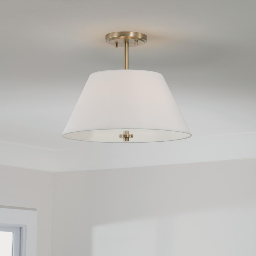 Transitional style meets modern details in the Parson Dual Mount Pendant. Whether hung as a pendant or a semi-flush, the tailored white fabric shade complete with a glass diffuser creates a soft glow and sophisticated aesthetic alongside the Matte Brass finish.