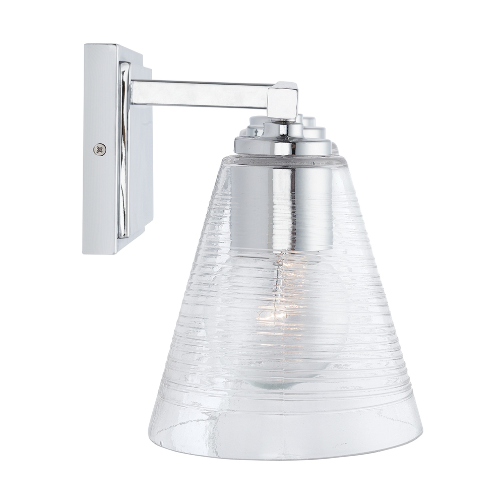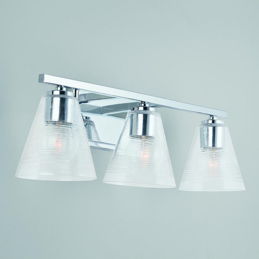 The cone-shaped glass on this 3-Light Vanity has a raised glass spiral texture on the exterior of the material, creating a unique texture and sparkle that is further emphasized by the Chrome finish.