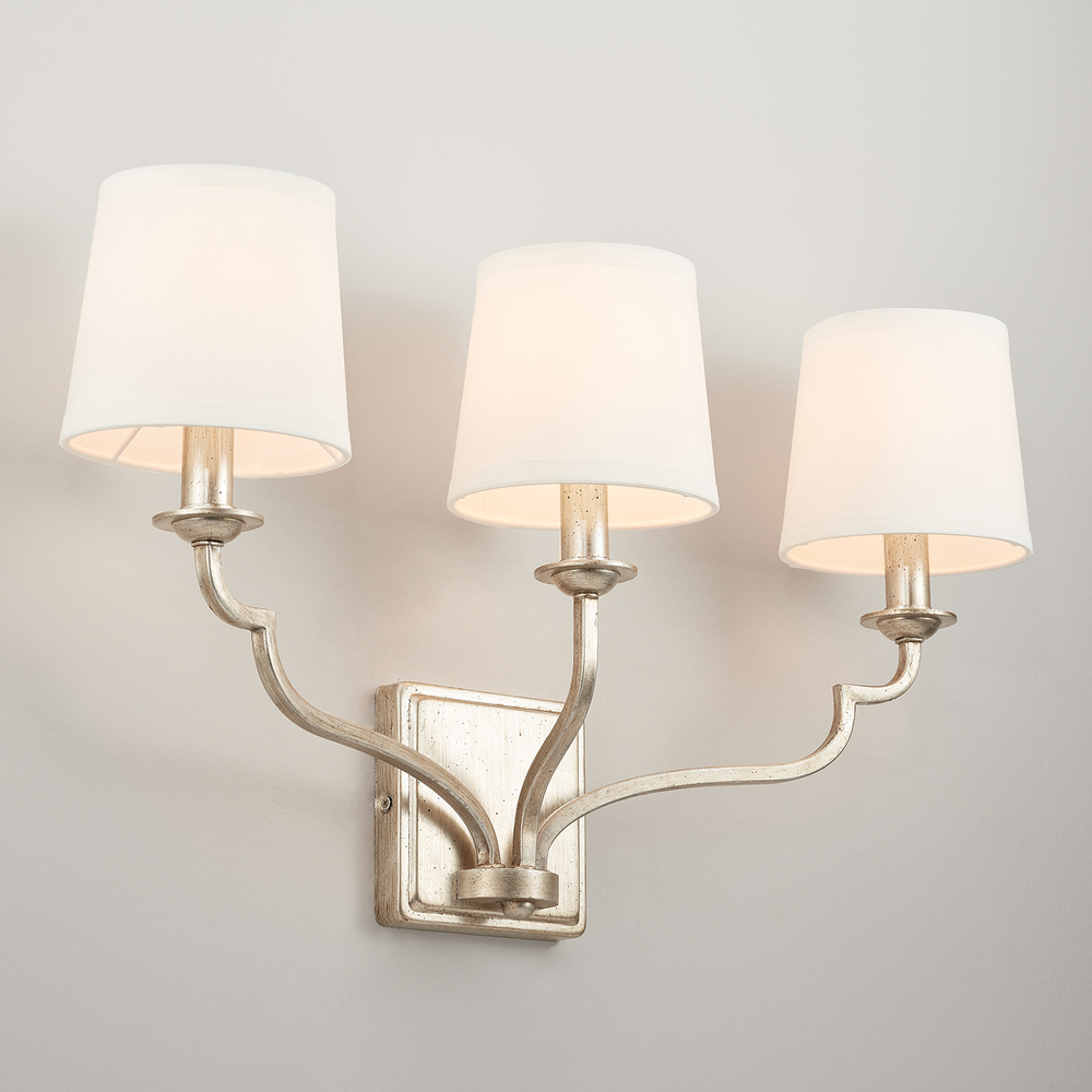 Artful, scripted curves create the silhouette of the 3-Light Vanity. Classic shapes and soft white fabric shades evoke a sense of romance and elegance.