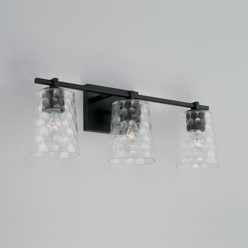 The clean lines in the Matte Black finish anchor the tapered honeycomb glass in the 3-Light Vanity for a sophisticated style. This fixture is available as a 2-light, 3-light or 4-light.