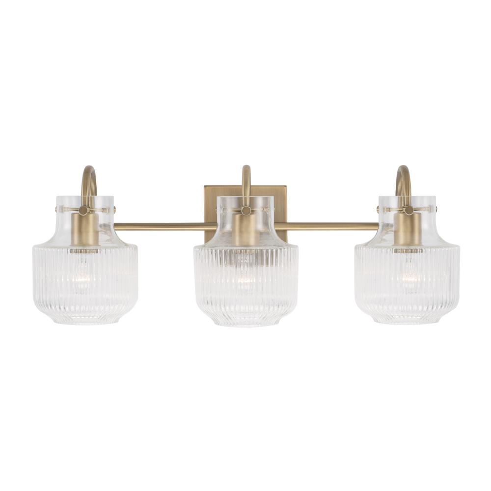 Fluted glass and a tulip silhouette create organic intrigue with the Nyla 3-Light Vanity. The warmth of the Aged Brass finish reflects a sleek and stunning style. Also available in a 2-Light.