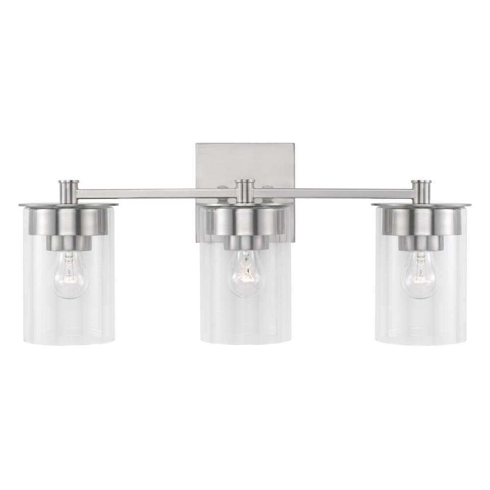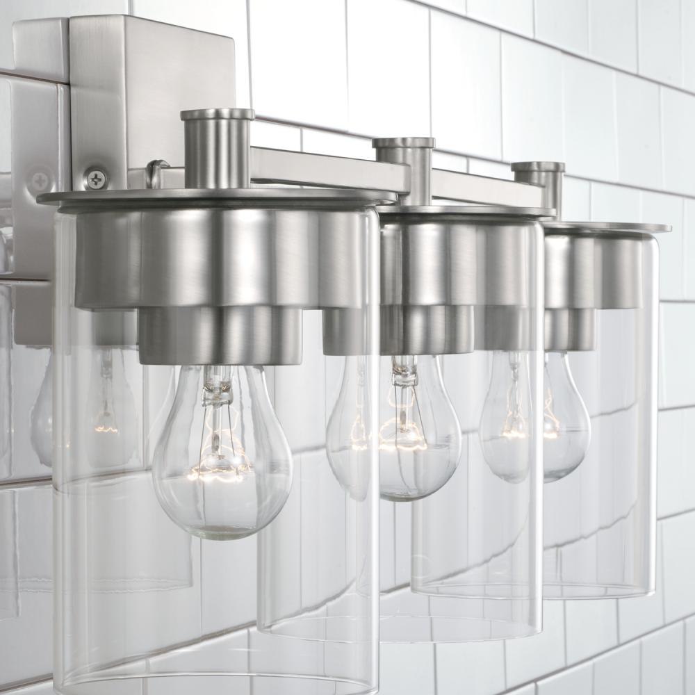Clean lines and modern forms create the Mason 3-Light Vanity for Homeplace. The Brushed Nickel finish accents the designer details and adds warmth to any bathroom. Also available in a 2-Light or 4-Light.