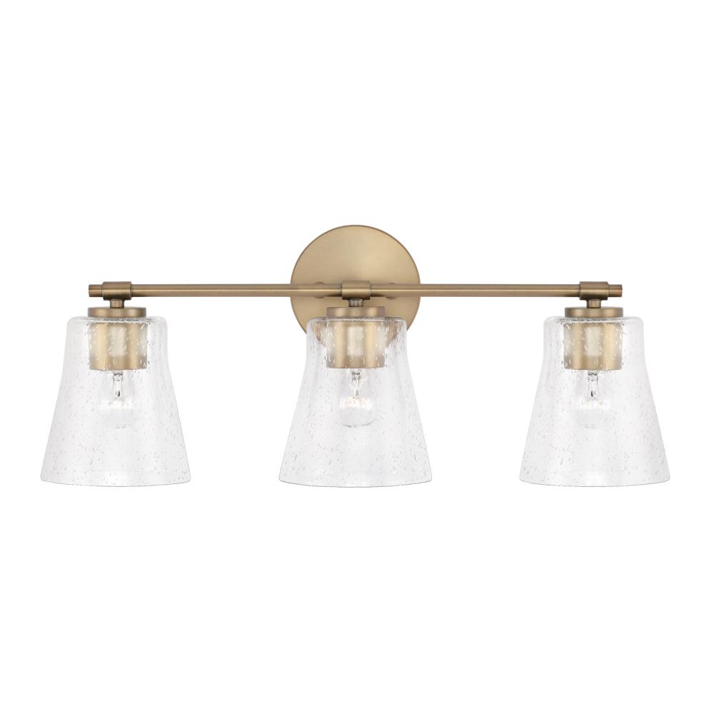 Simple and sleek, the Baker 3-Light Vanity for Homeplace brings standout style to signature pieces. The Aged Brass finish beautifully accents the tapered seeded glass for versatility and sophistication. Also available in a 2-Light or 4-Light.
