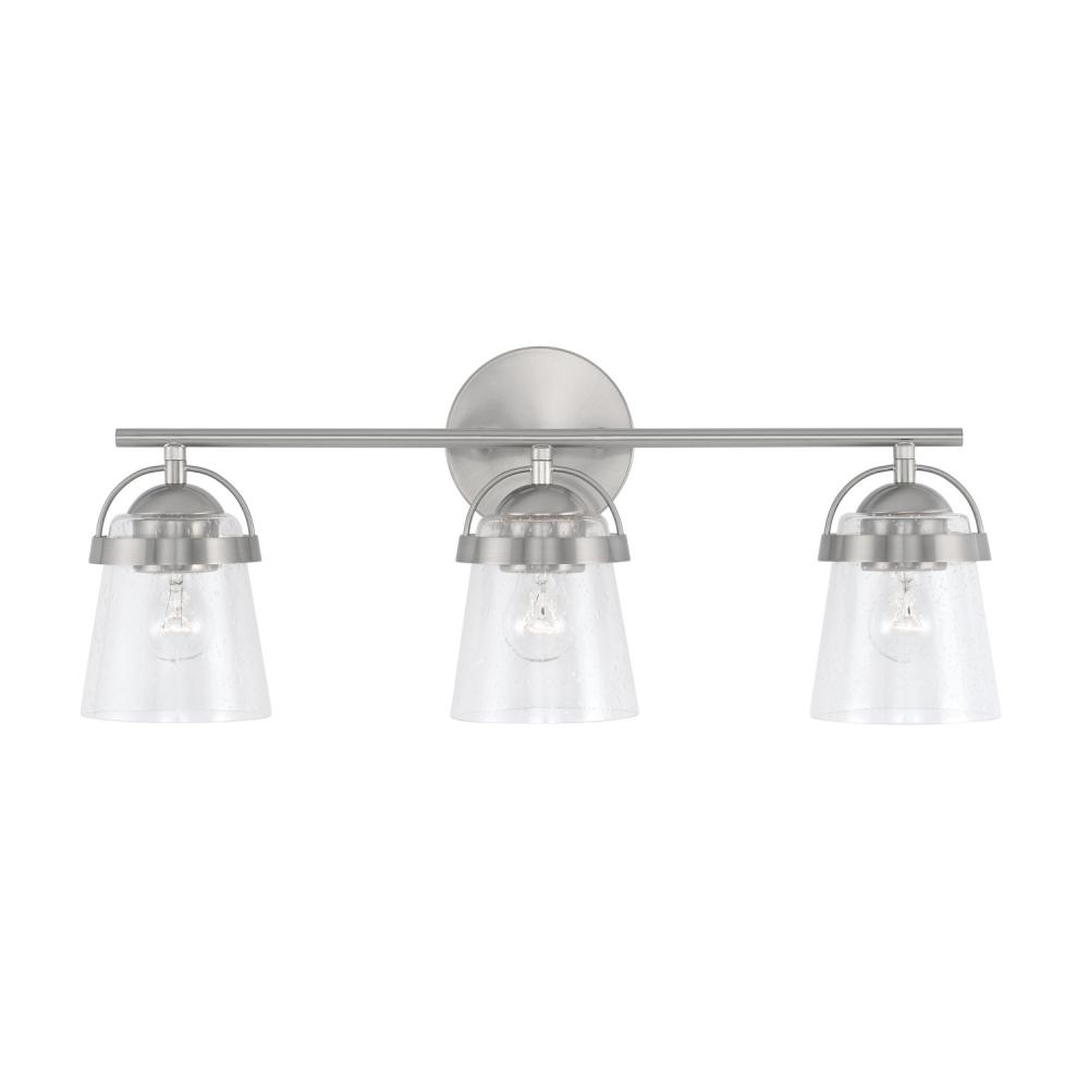 Chic curves and clean lines create the Madison 3-Light Vanity for Homeplace. The Brushed Nickel finish adds texture and accents the seeded glass for standout style. Also available in 2-Light and 4-Light.