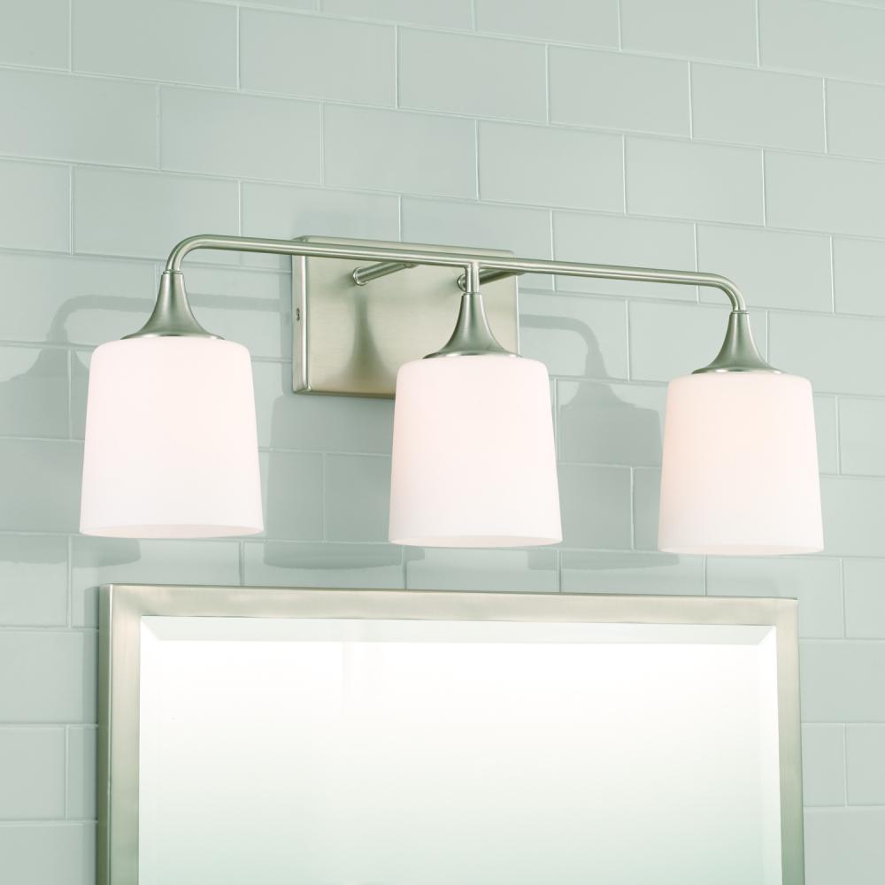 26.25"W x 10.25"H 3-Light Vanity in Brushed Nickel with Soft White Glass