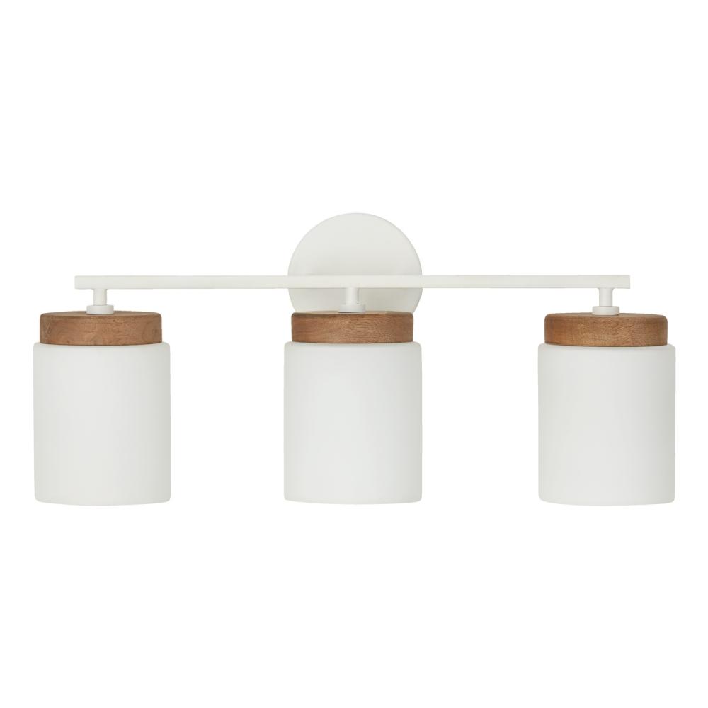 Mango wood and modern design form the Liam 3-Light Vanity. Cylindrical Soft White glass shades combined with the Matte White finish make a sophisticated combo, while the Light Wood details create a visual balance for natural Scandinavian style.
