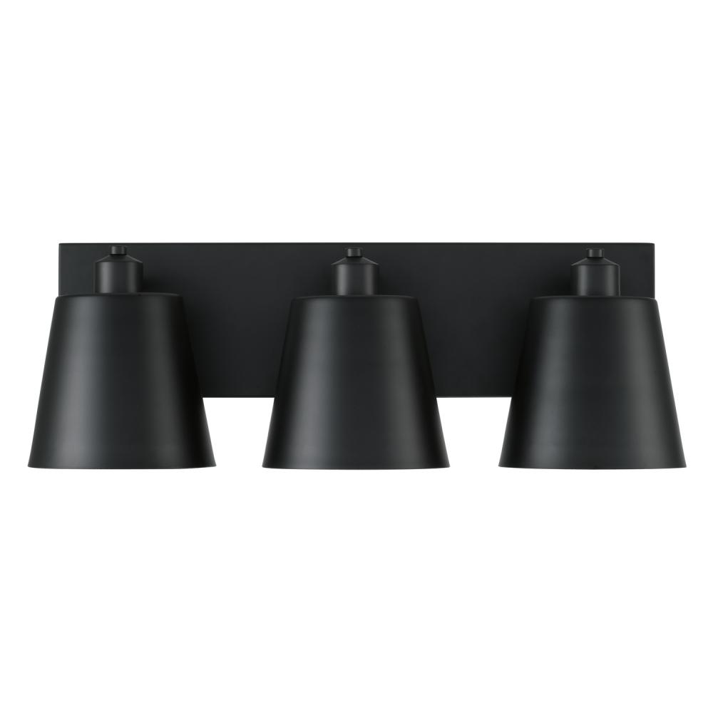 Angled metal shades and an extended backplate bring a bold, modern look to the Alden 3-Light Vanity. The Matte Black finish with White interior delivers a distinct aesthetic that complements any style.