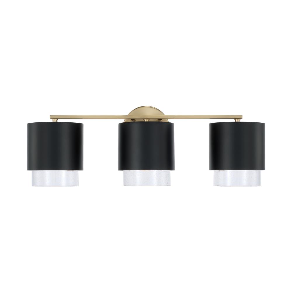 Contemporary forms meet illuminated elegance. The Weller 3-Light Vanity combines sleek, cylindrical silhouettes with seeded glass to cast a unique powder room glow. The Matte Black finish with painted Matte Brass interior brings mixed metal intrigue and a hint of shine.