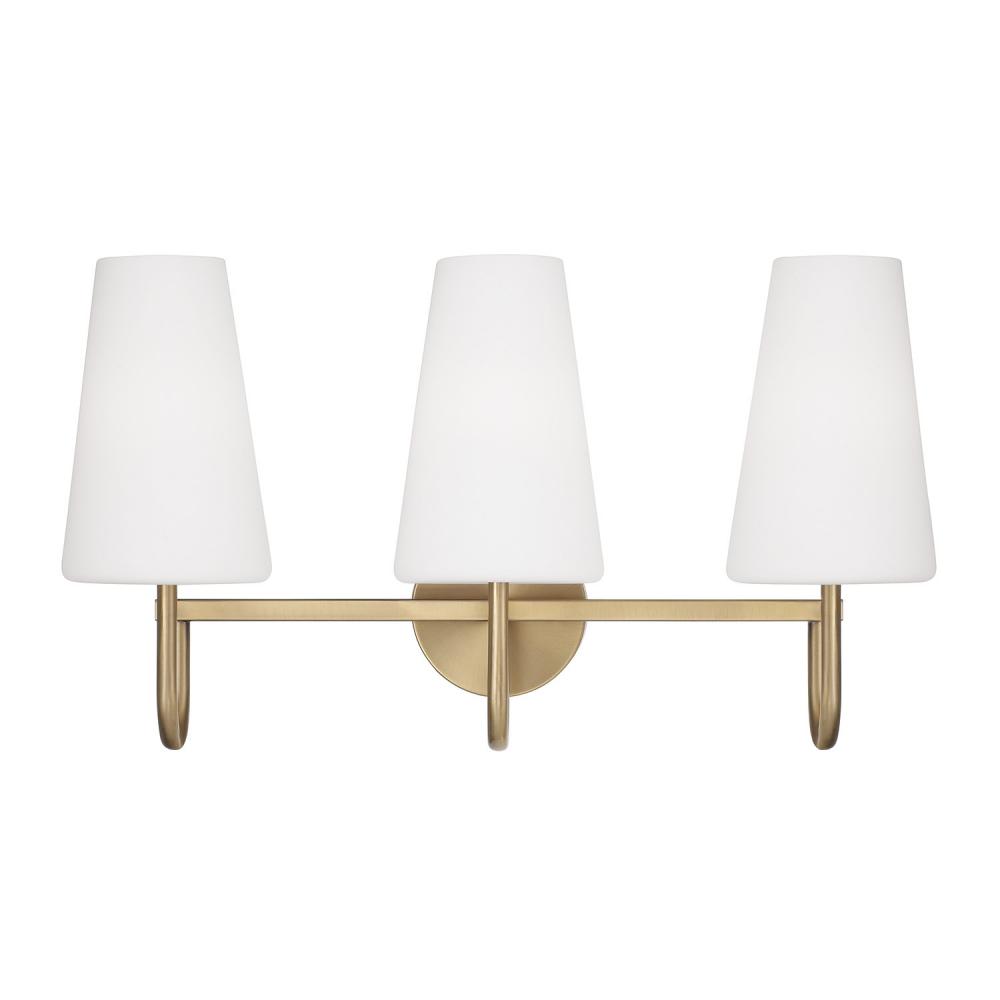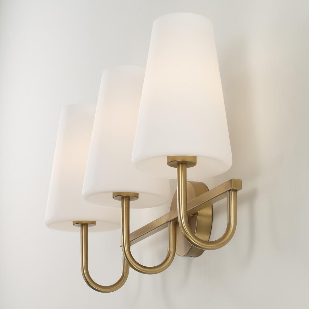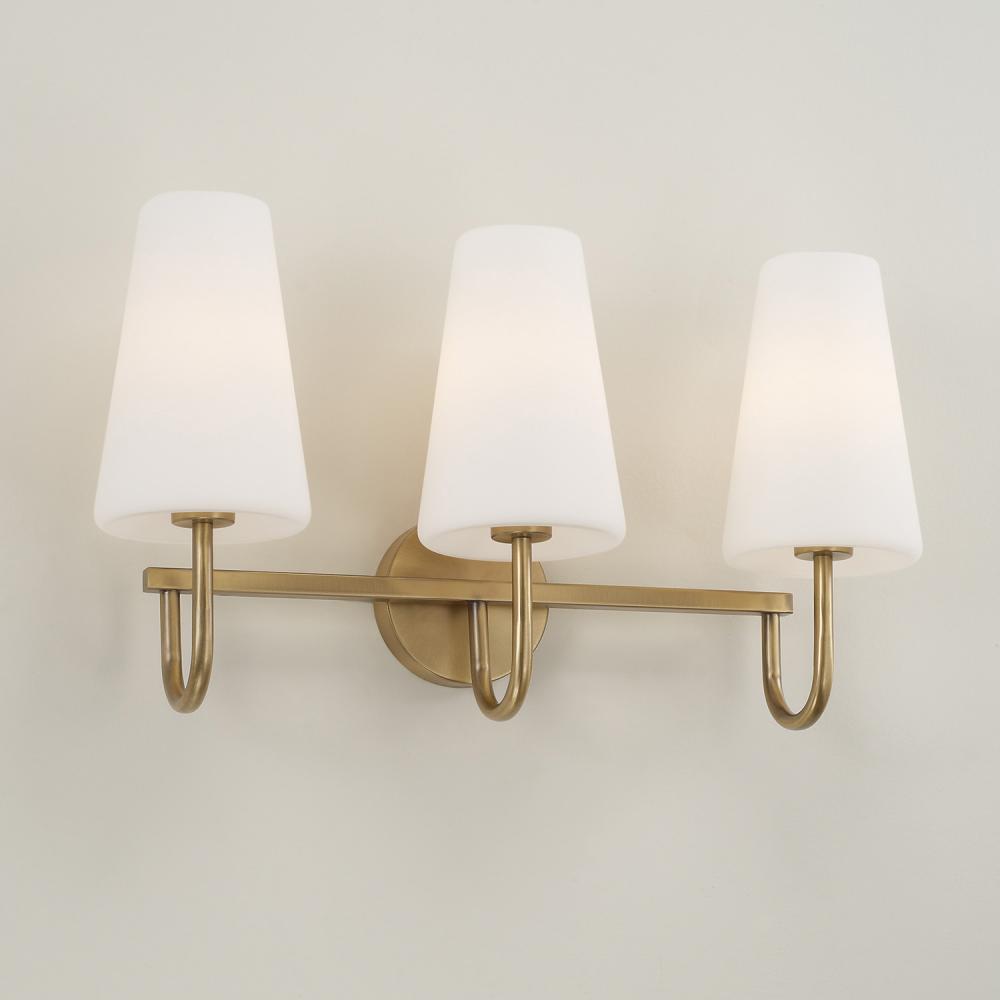 Classic curves and grand scale create elegant transitional style in the Averitt Vanity. The elongated Soft White glass tapered shades complement the sleek arms to bring effortless sophistication to any bathroom, while the Aged Brass finish creates visual warmth and subtle shine.