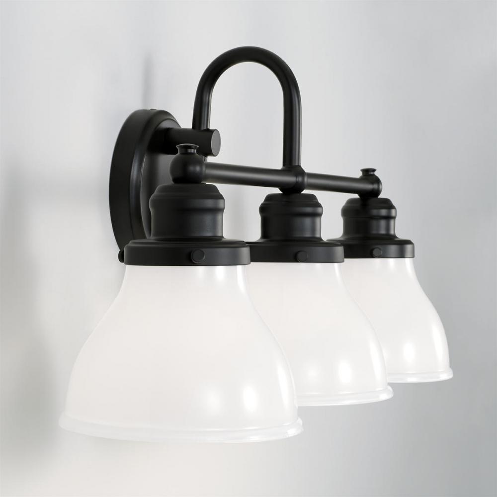 Featuring a Matte Black finish and cloche-style Milk Glass shades, the Baxter 3-light vanity brings tasteful illumination to your bath. Its clean profile is marked by a centrally positioned, u-shaped arm and a straight rod, conveying industrial inspiration.