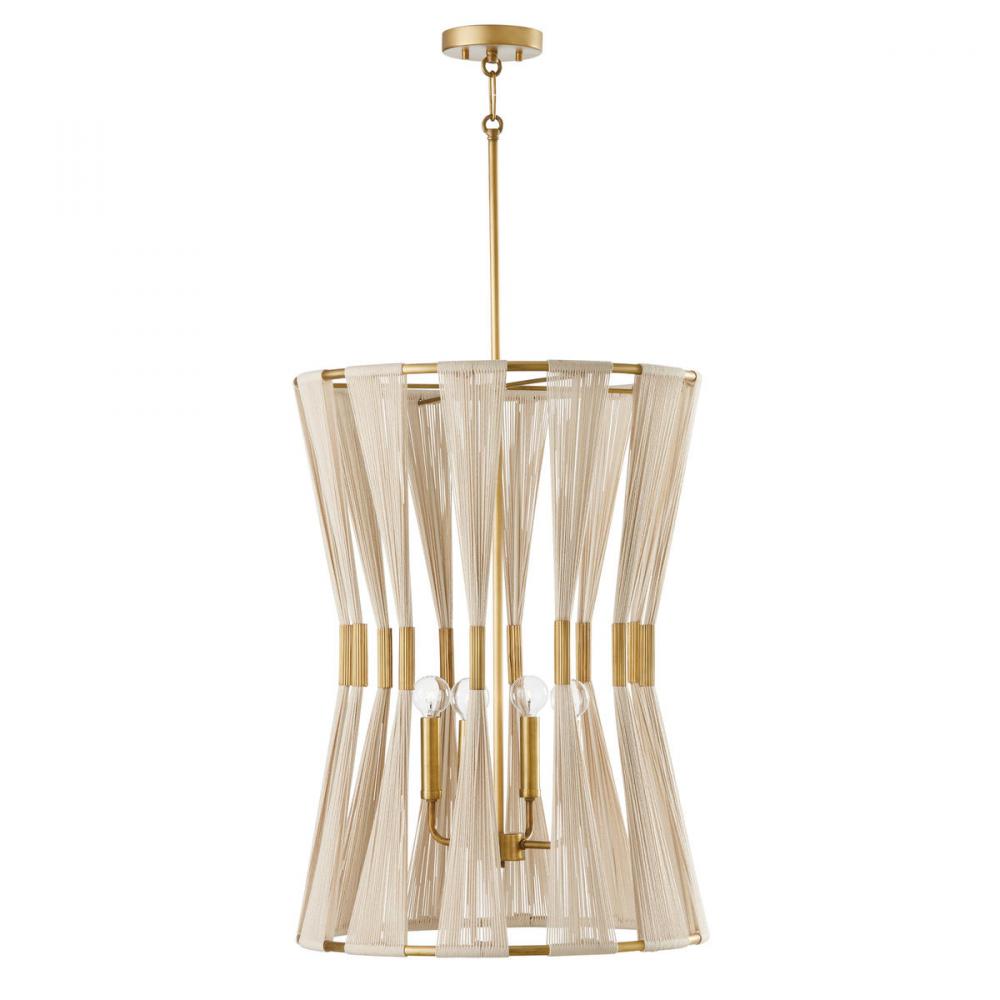 A tapered silhouette, gathered rope accents, and a material mix of hand-wrapped Bleached Natural Rope and slightly distressed painted Brass create contrast, drama and glamour in the Bianca Collection. This show-stopping 4-Light Foyer is available in multiple sizes.