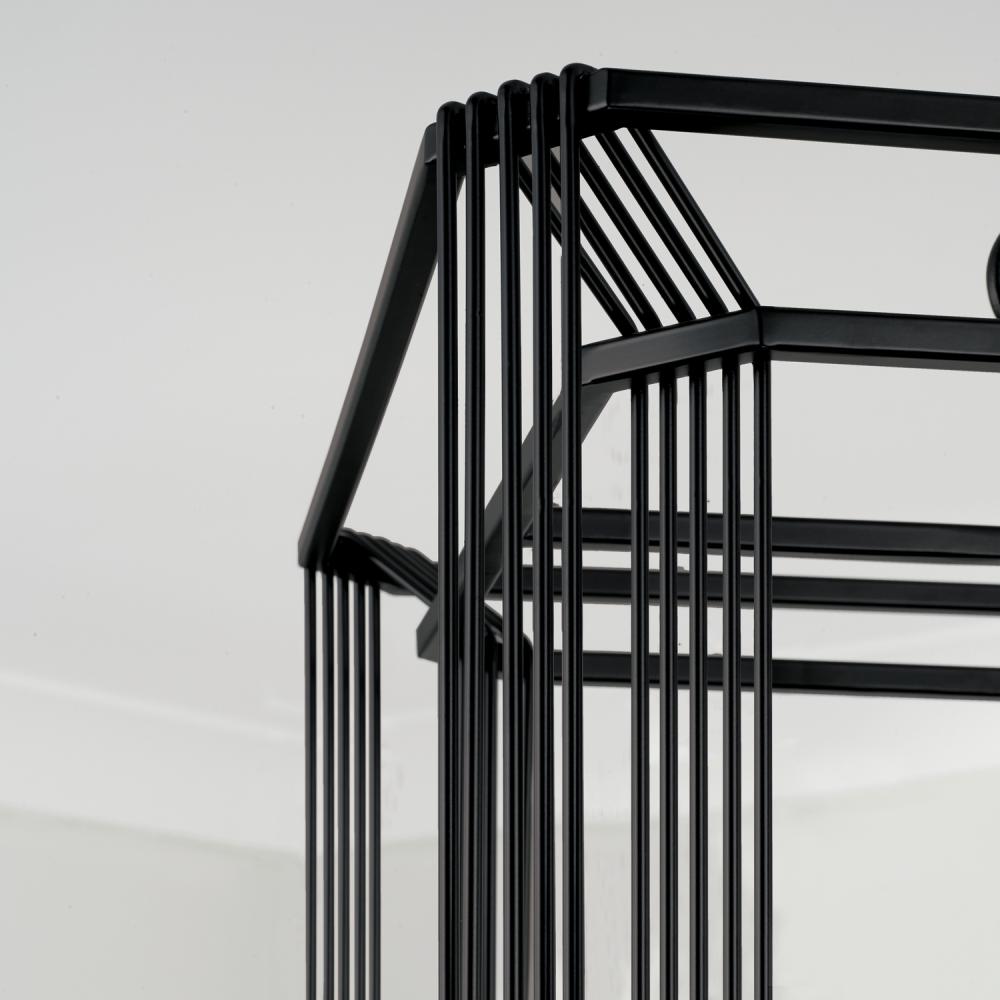 Intricately wrapped metal details create a mesmerizing configuration with the Lennon Foyer. The Matte Black finish punctuates the open-air lantern design for streamlined sophistication.