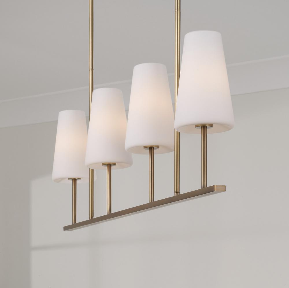 The Averitt Linear Chandelier delivers elegant transitional style with grand scale. The unique rounded, recessed bottom detailing adds to the high design of the elongated Soft White glass tapered shades, while the Aged Brass finish brings subtle shine and sophistication to the straightforward silhouette.