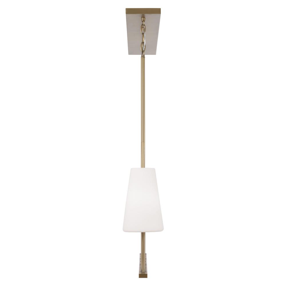 DETAILS: Elongated Soft White glass shades and sleek Aged Brass details bring an elegant aesthetic to the large-scale silhouette.