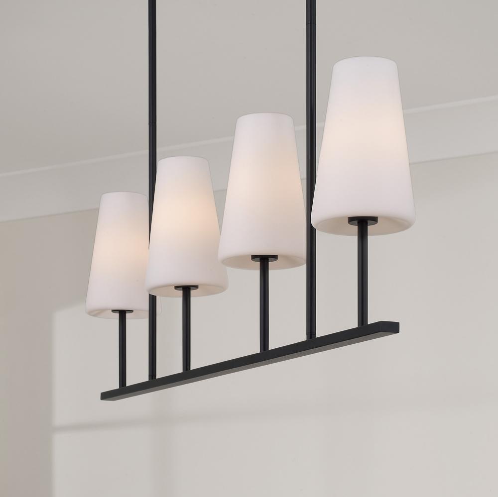 The Averitt Linear Chandelier delivers elegant transitional style with grand scale. The unique rounded, recessed bottom detailing adds to the high design of the elongated Soft White glass tapered shades, while the Matte Black finish brings sophisticated contrast to the straightforward silhouette.