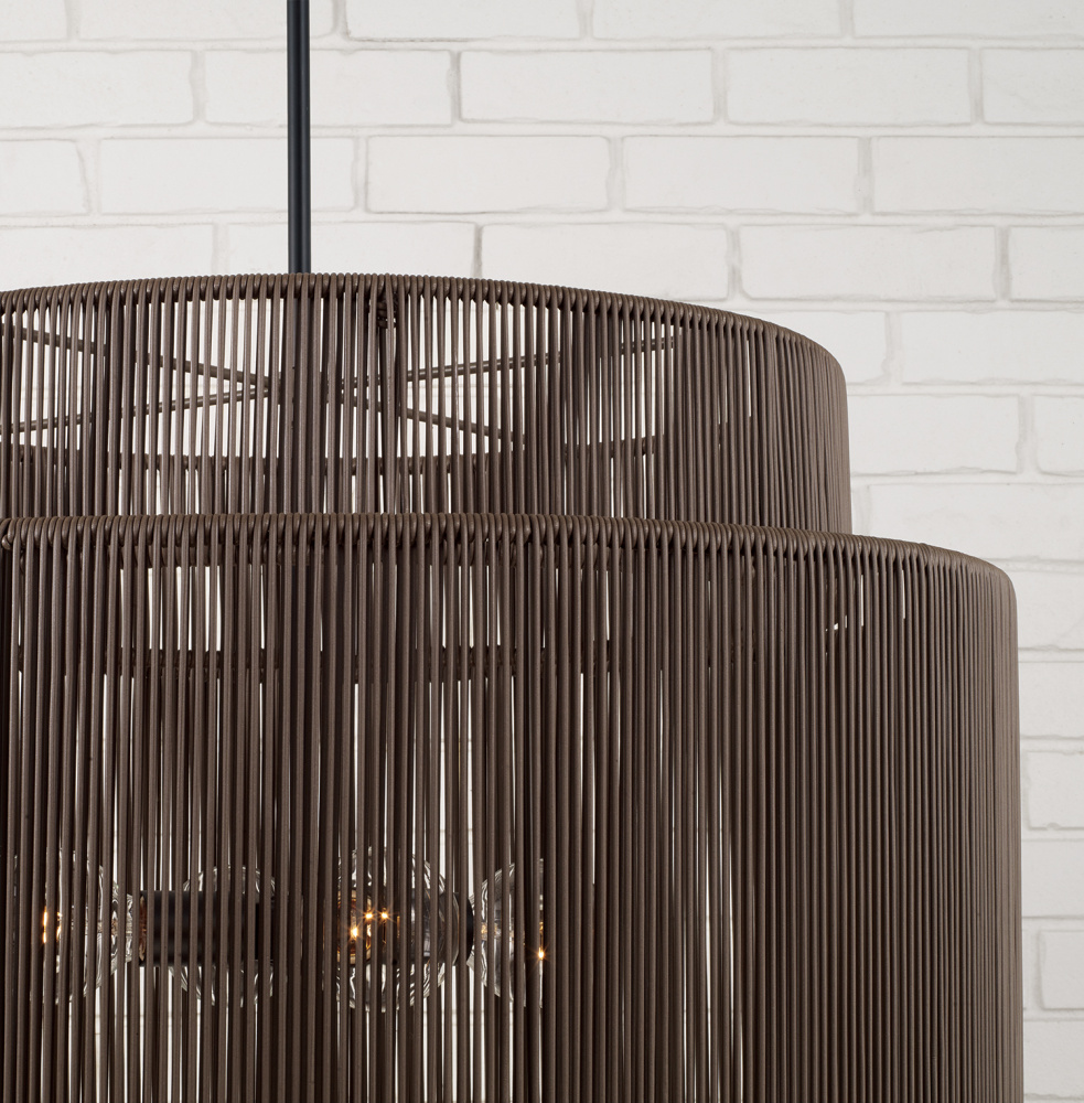 Purposefully crafted for interior and exterior spaces, the Jasper Indoor/Outdoor Large Pendant seamlessly blends durable design with high style. In a tiered drim silhouette, the weather-resistant hand-wrapped resin delivers a moody aesthetic in dark Umber brown, while the Matte Black finish gives a nod to modern style. Rated for Damp Locations and backed by our one-year warranty.