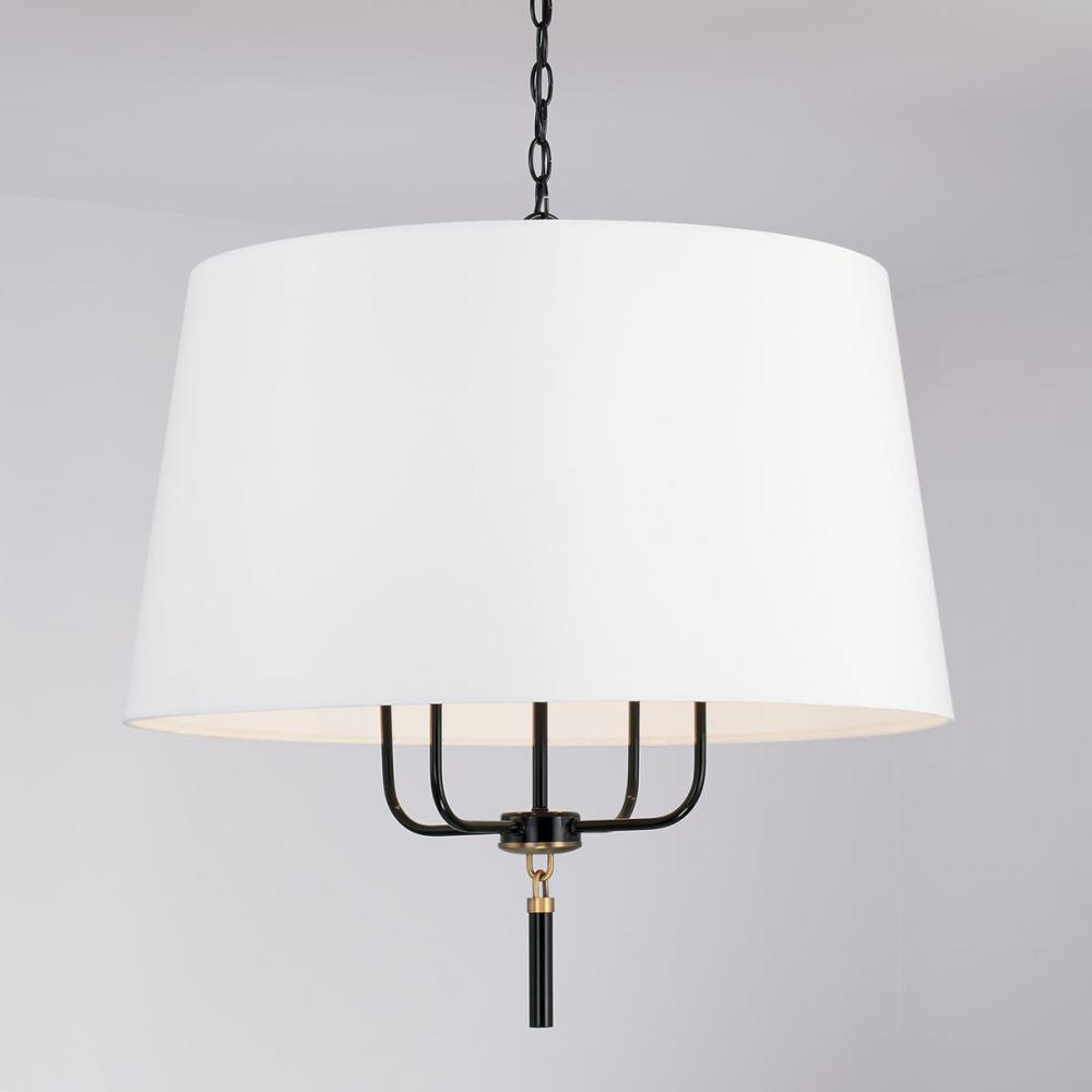 The striking contrast of Glossy Black with tailored fabric shades gives a perfectly polished look to the Beckham 4-Light Pendant. The solid metal tassel detail is accented with Aged Brass loops for a sleek silhouette that is both bold and refined.