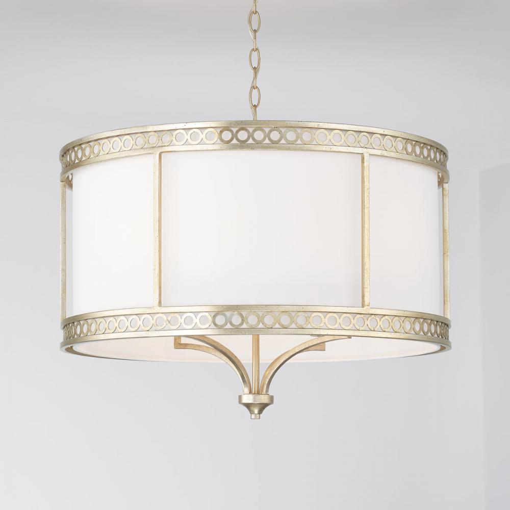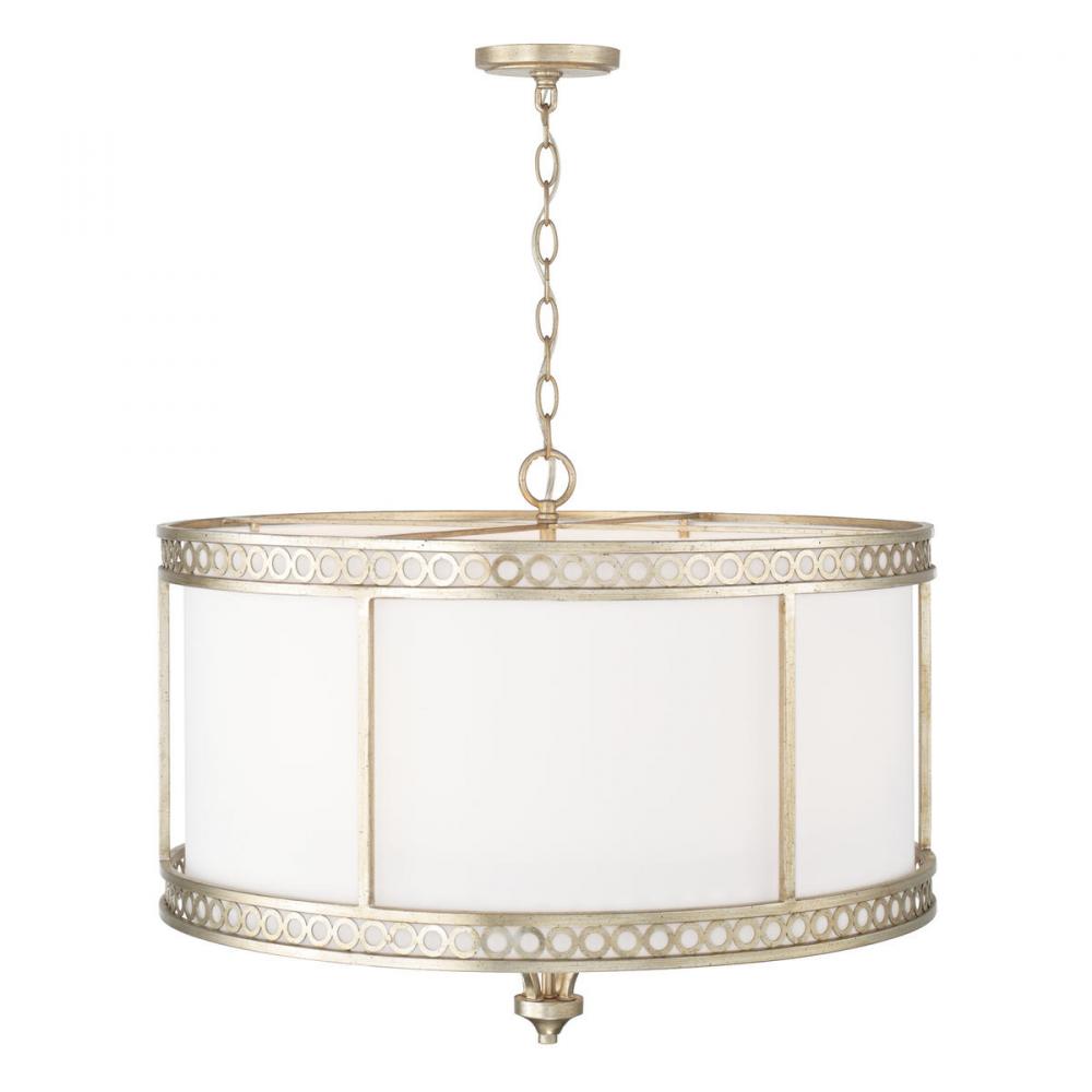 A tailored drum shade is accented by two intricate bands of circles in the Isabella 4-Light Pendant. The Winter Gold finish creates a relaxed, yet regal style.