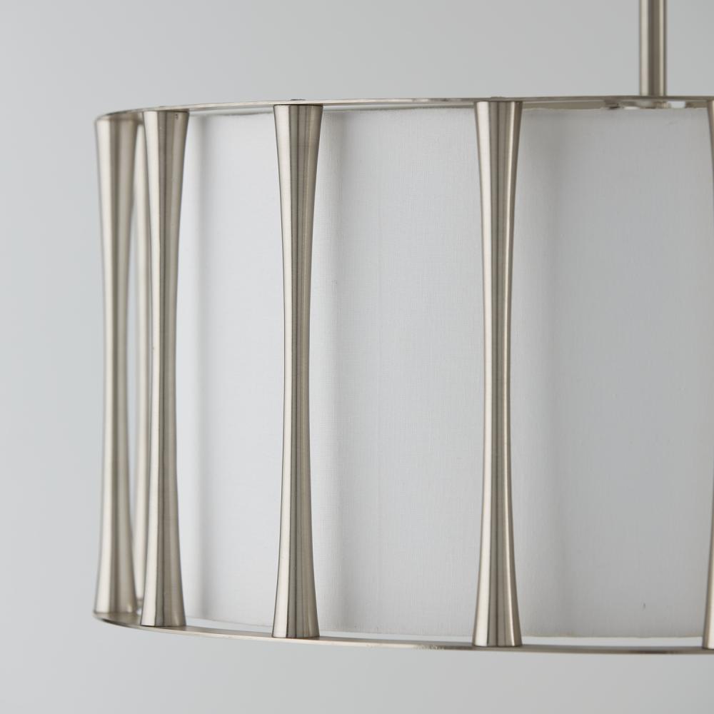 Soft and statement making, the Bodie Pendant adds a layer of luxury to any space. The tapered columns in Brushed Nickel frame the tailored fabric shade, creating a sophisticated luminaire to match your style.