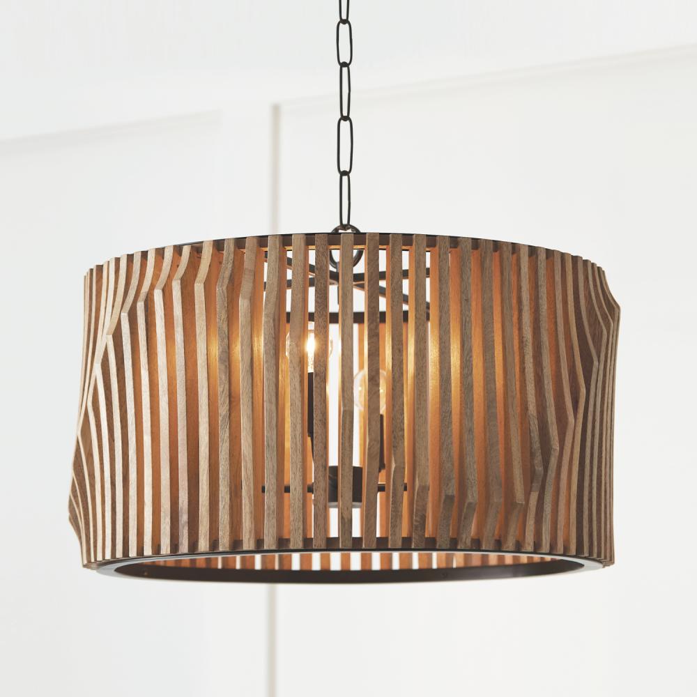 The sculptural style of the Archer Pendant is stunning from every angle. Artisan-crafted slats of light mango wood create the sensation of motion in a visually intriguing wave grounded by a Matte Black metal frame.