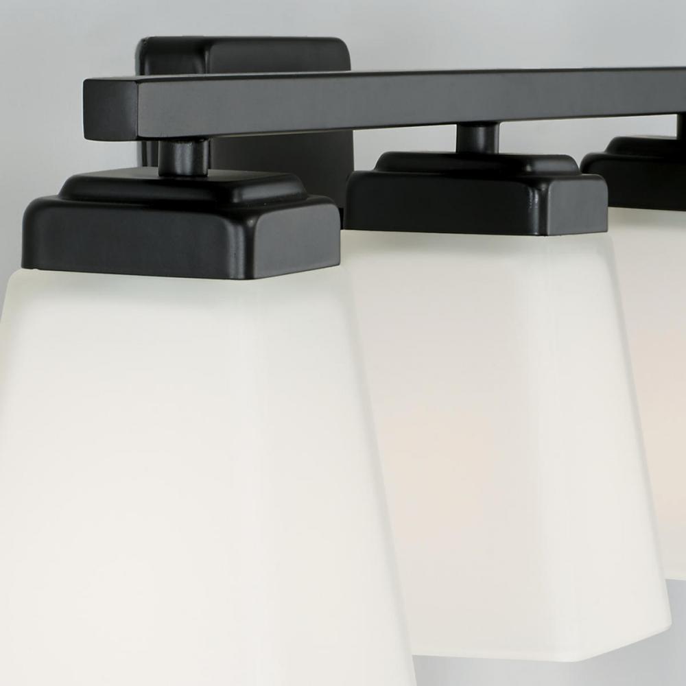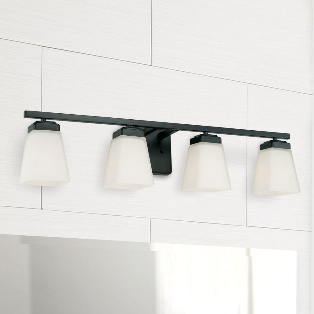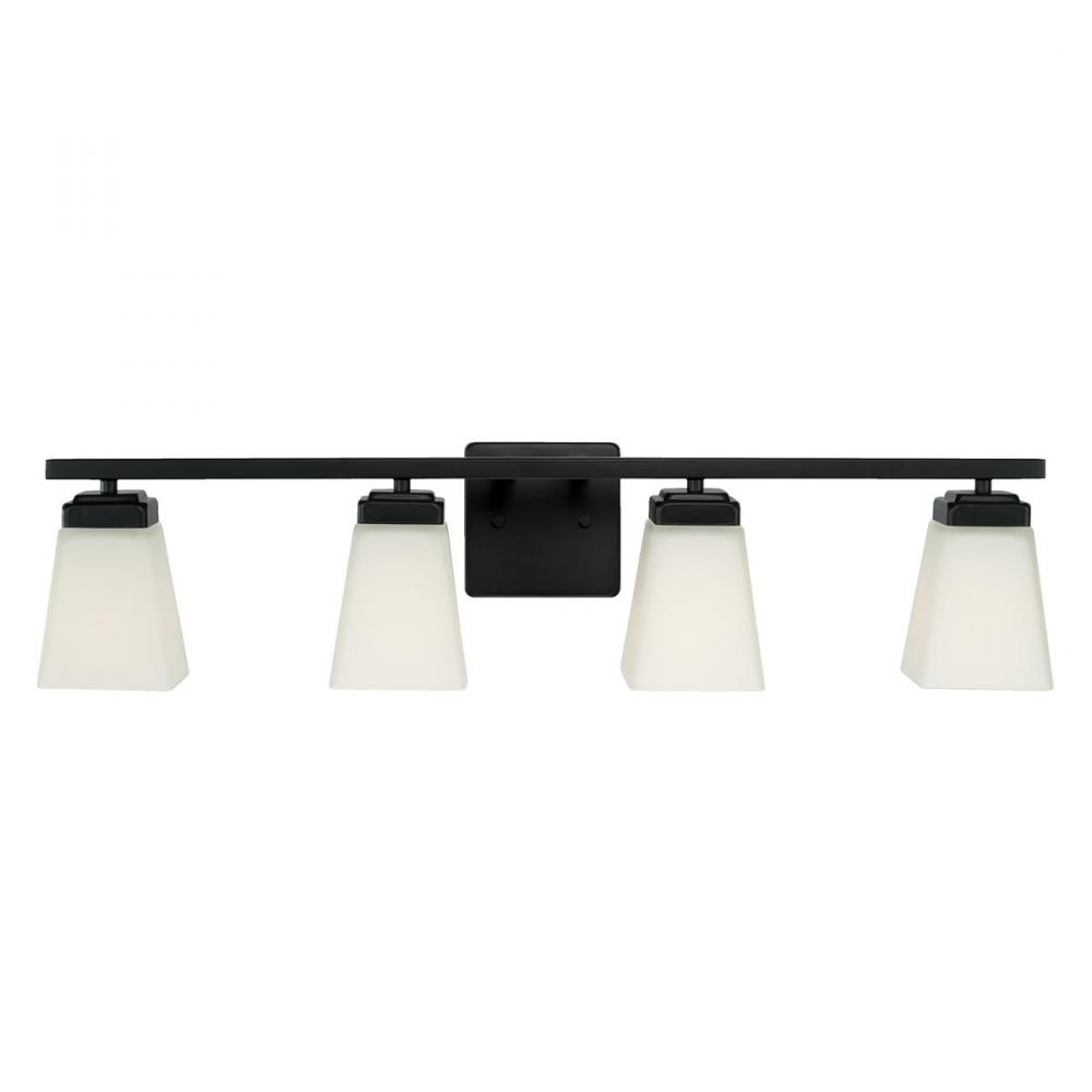 Clean and classic, the Baxley 4-Light Vanity for HomePlace is designed for simple, yet statement making style. The soft white glass softens the straight lines and the Matte Black finish gives a contemporary update to the transitional silhouette.