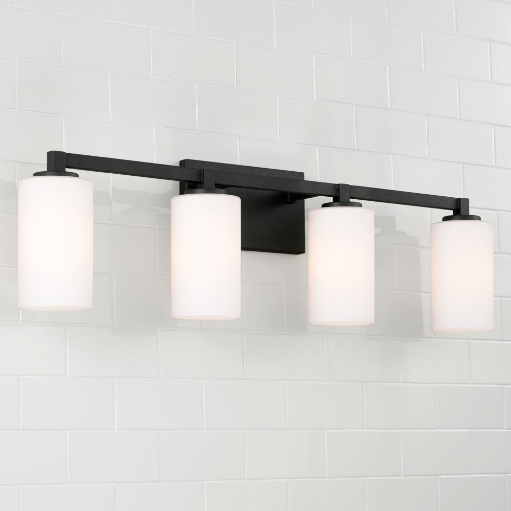 32.75"W x 9.5"H 4-Light Vanity in Black Iron with Soft White Glass