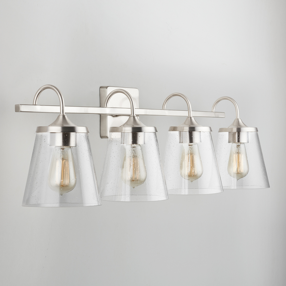 The wide cone seeded glass on this 4-Light Vanity is suspended by a simple arched arm and tapered metal cap makes it a timeless shape for any bathroom vanity.