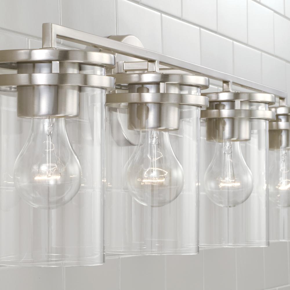 DETAILS: Clear glass cynlinders in 2-Light, 3-Light, or 4-Light available in three finishes of Aged Brass, Brushed Nickel, or Matte Black for style versatility.