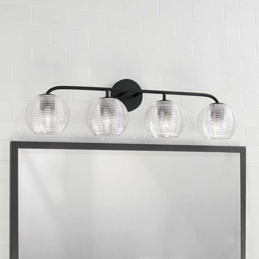 33.5"W x 9.5"H 4-Light Vanity in Matte Black with Clear Ribbed Glass