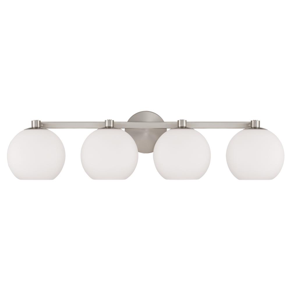 Circular forms meet all-around versatility in the Ansley 4-Light Vanity for HomePlace. The Soft White glass globe shades illuminate sophisticated style, while the Brushed Nickel finish creates a classic aesthetic.