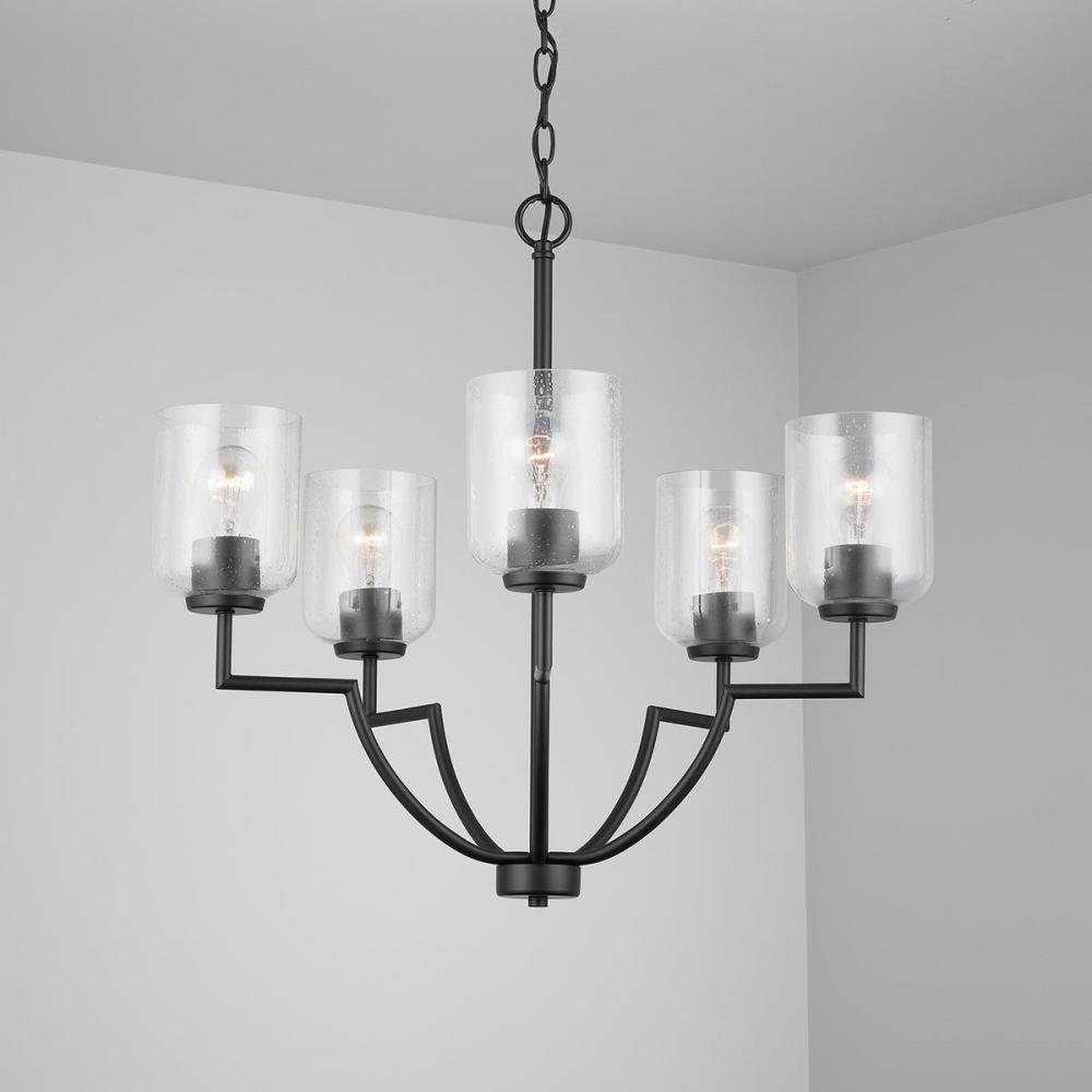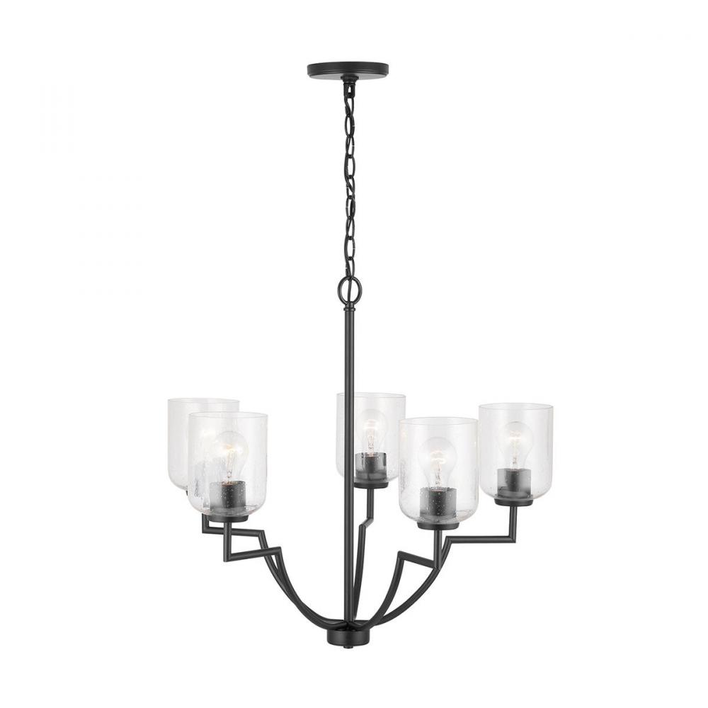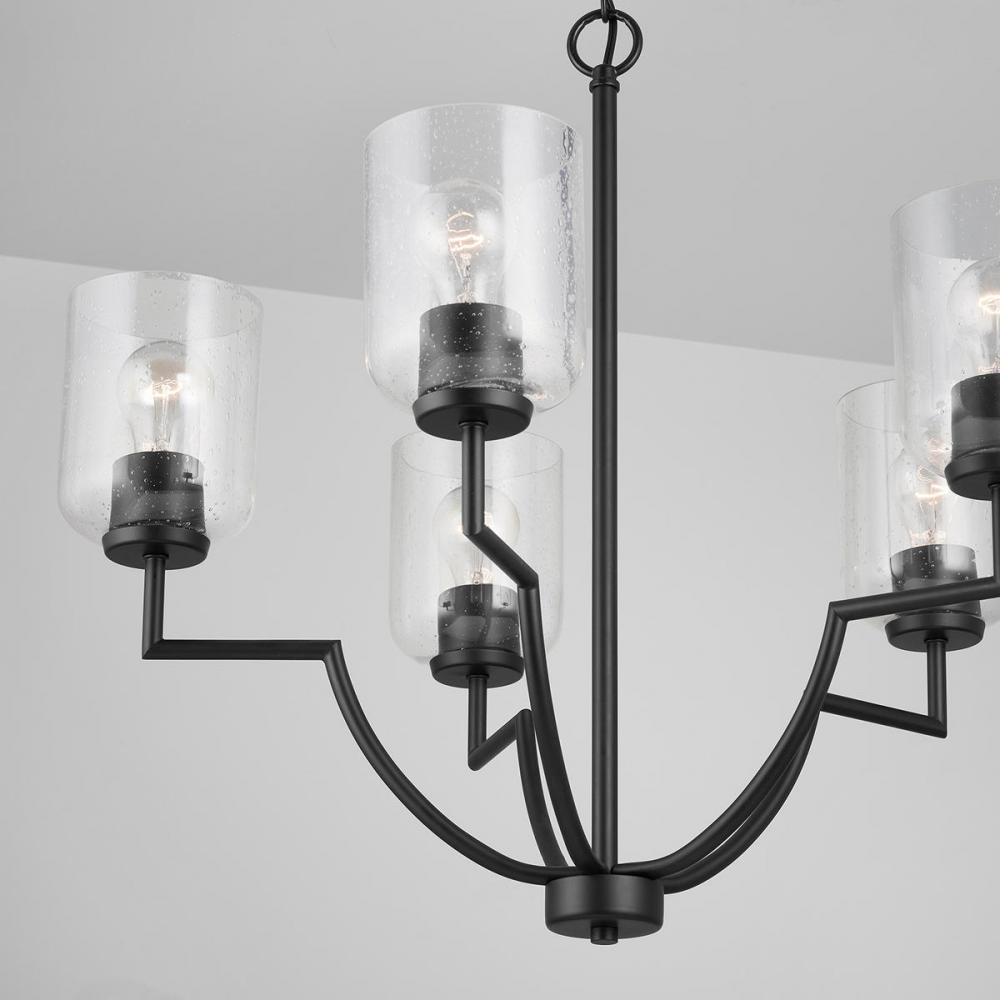 Taking a cue from iconic modern design patterns, these versatile fixtures are both streamlined and sculptural. The seeded glass provides a subtle texture to the understated style. The five-light chandelier is available in Brushed Nickel, Matte Black or Bronze.