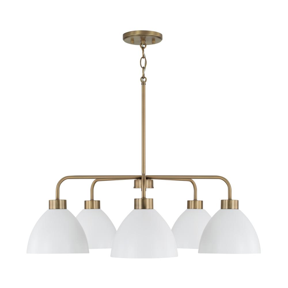 Invite charming style to any space with the Ross 5-Light Chandelier. The curved White metal shades create a retro silhouette, while the Aged Brass details give a nod to mid-century style.