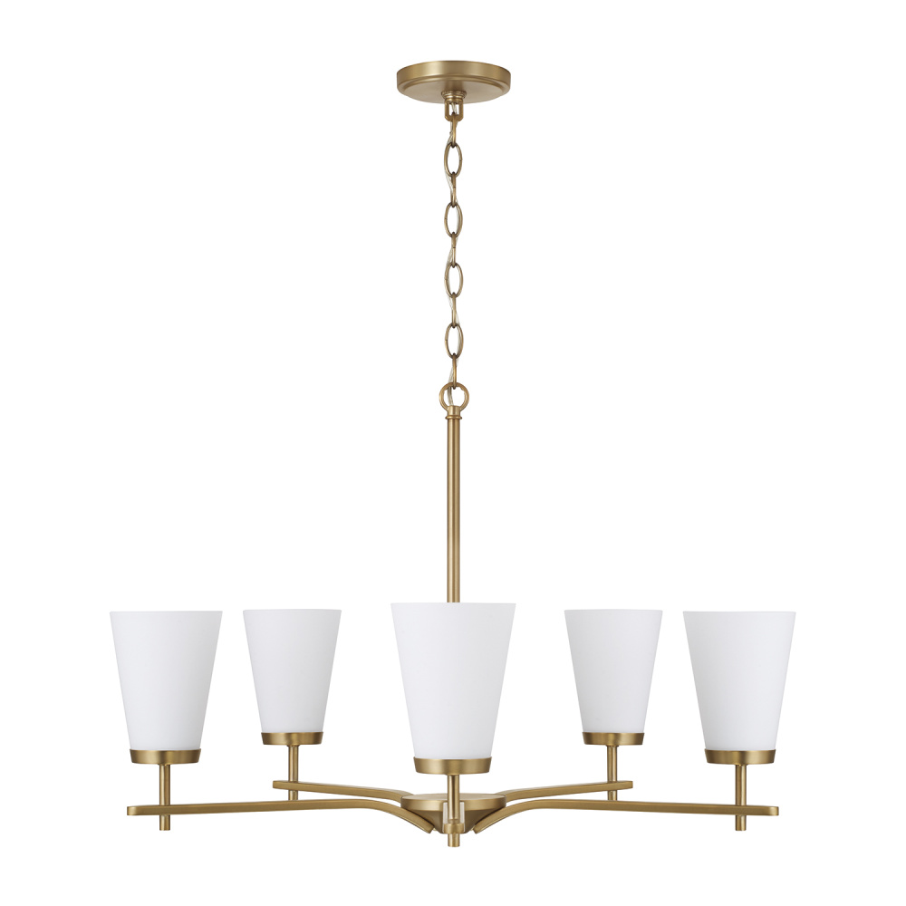 The Drake 5-Light Small Chandelier for HomePlace brings clean and classic style to any space. Paired with sleek, intersecting arms, the tapered Soft White glass shades create an ambient glow, finished in Aged Brass for sophisticated style.