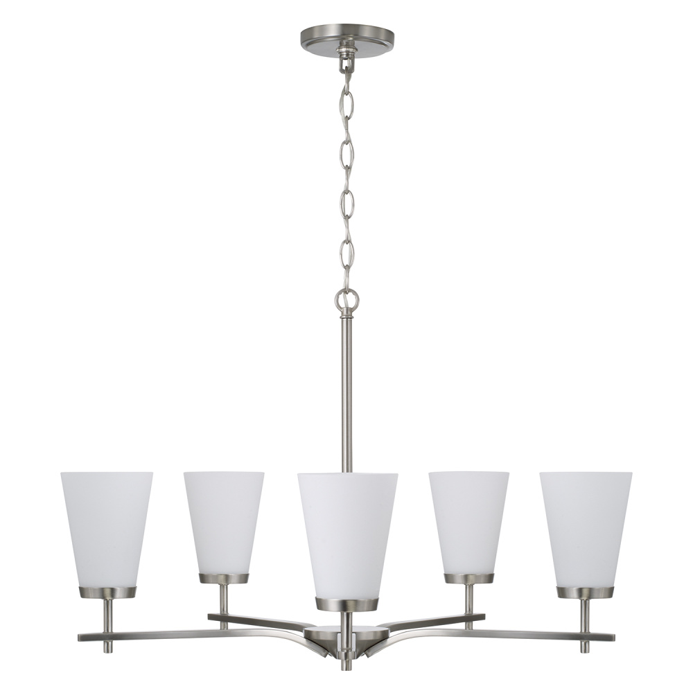The Drake 5-Light Small Chandelier for HomePlace brings clean and classic style to any space. Paired with sleek, intersecting arms, the tapered Soft White glass shades create an ambient glow, finished in Brushed Nickel for versatile style.