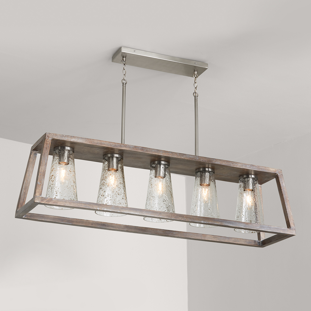Modern silhouettes paired with natural handcrafted materials create a refined rustic look in this collection. Hand-blown, cone-shaped, stone seeded glass is paired with a handcrafted Mango wood frame. Slight variation may occur.
