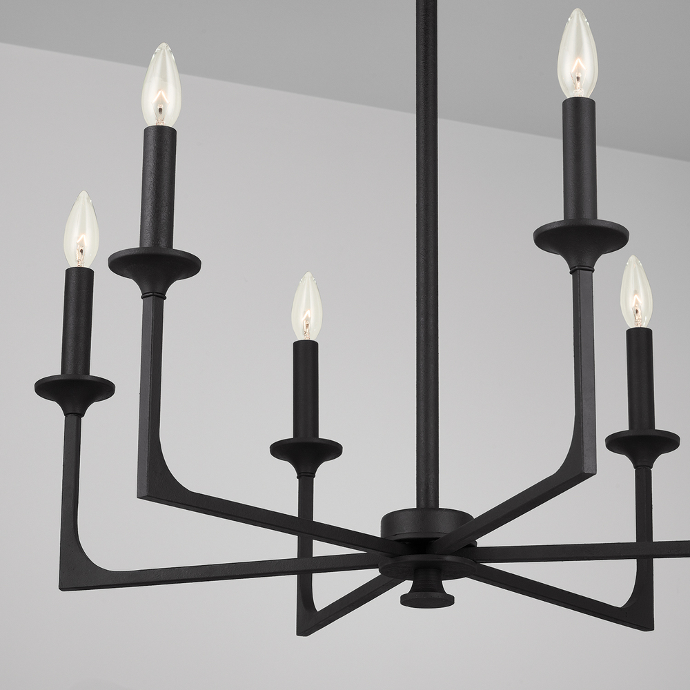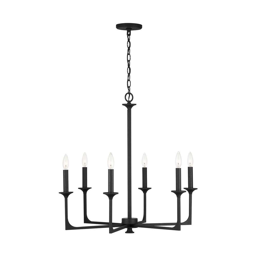 Understated lines in the Clint 6-Light Chandelier beautifully complement the bold prominence of the Black Iron finish. The unique corner details of this transitional design are reminiscent of turn of the century style. Also available as as 8-Light Chandelier.