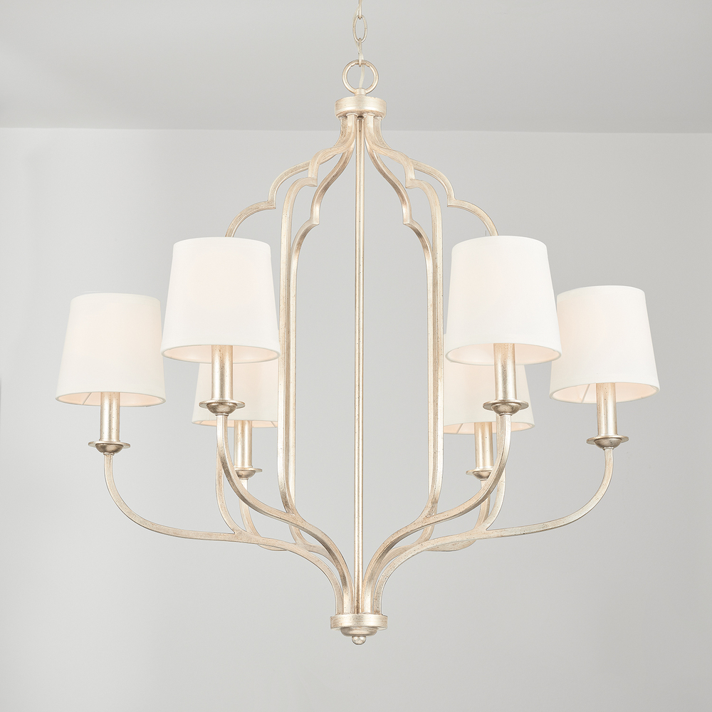 Artful, scripted curves create the silhouette of the 6-Light Chandelier. Classic shapes and soft white fabric shades evoke a sense of romance and elegance.